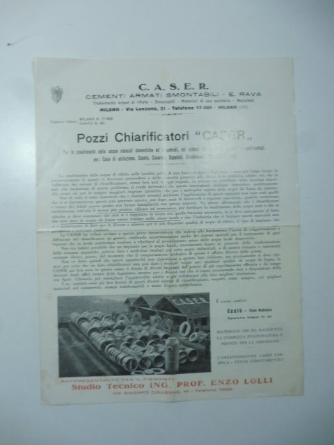 Pieghevole di 4 facciate (ciascuna misura cm 23 x 30). Pieghevole pubblicitario non datato, ma ascrivibile agli anni Quaranta, sui pozzi chiarificatori Caser per lo smaltimento delle acque cloacali ed industriali.