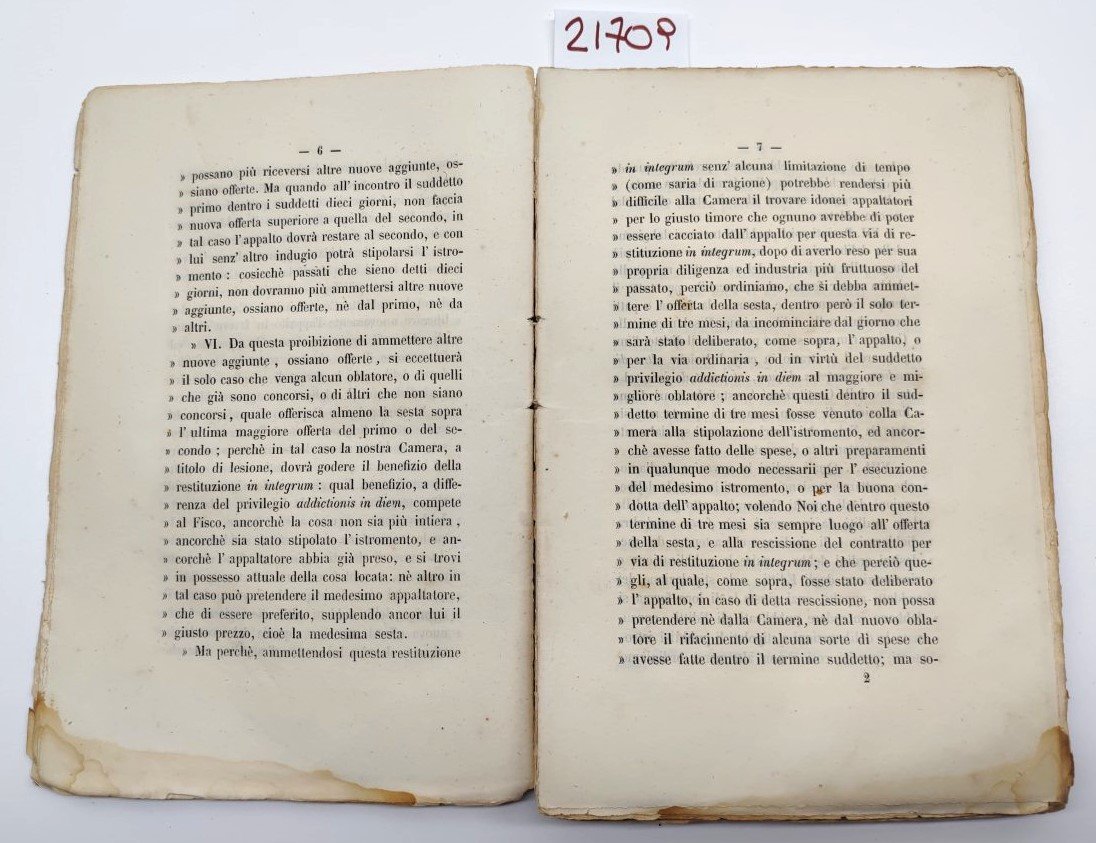 In pessime condizioni, copertina morbida editoriale riquadrata con carta ai margini per mancanze visibili alla seconda di copertina, fioriture e aloni ai piatti, dorso assente, legatura molto allentata, quasi a fogli sciolti, manca la quarta di copertina, tagli irregolari leggermente bruniti, frontespizio e prime due pagine con una mancanza al margine esterno, un alone di umidità al margine inferiore che va via via diminuendo ma che è presente su tutto il volume, alcuni strappi in corrispondenza della cerniera, alcune pagine di dimensioni inferiori rispetto alle altre, alcuni segni a matita blu al margine del testo e sottolineature in circa tre pagine, lievi fioriture alle pagine interne che non vanno a disturbare la lettura, numero pagine IX + 245,angolo inferiore esterno mancante sulle ultime due pagine, dimensioni centimetri 22,5 x 15,5