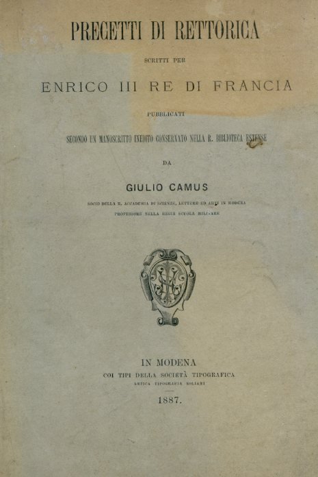 In-4°, pp. 46, cartonatura editoriale a stampa con dorso in tela. Ottimo stato. Prima edizione in volume a se, estratta dal vol. V, serie II delle 'Memorie della R. Accademia di Scienze, Lettere ed Arti di Modena', pp. 69 e sgg. Pubblicazione di anonimo trattatello retorico (ma l'autore era probabilmente un gesuita) composto per Enrico III Re di Francia ('Rhetorique françoise faicte particulierement pour le Roy Henry 3'), tratto da un codice della Biblioteca Estense di Modena. La presente pubblicazione è fra l'altro menzionata da Frances Yates nel suo studio su 'The French Academies in the Sixteenth Century' come esempio della 'contemporary evidence of Henri's powers as an orator'. Il curatore, Giulio Camus, fu professore nella Scuola Militare di Modena e socio della Regia Accademia della città emiliana.