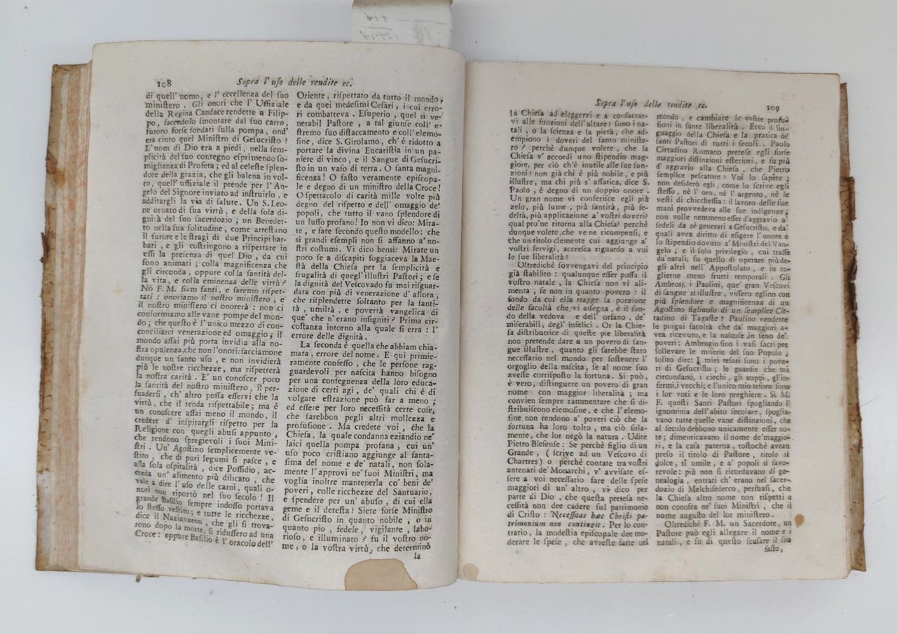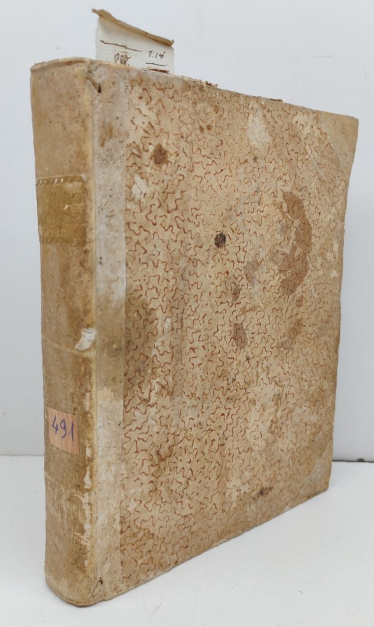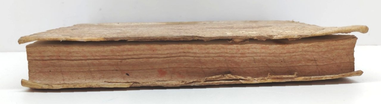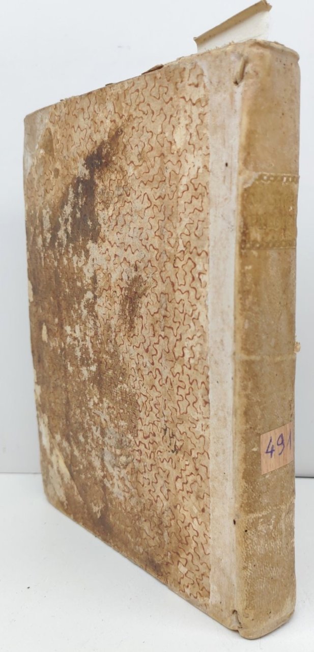 legatura rigida in mezza pelle con piatti cartonati in condizioni accettabili con aloni e macchie, dorso in pelle con etichetta di catalogazione e tassello con il titolo leggermente sbiadito, alcune lievi mancanze, tagli spruzzati in rosso impolverati quelli superiori, rotture all'unghia delle pagine, seconda di copertina con ex-libris e alcune lievi macchie, interno in discrete condizioni, testatine dei capitoli xilografate, alcune macchie alle pagine interne che non vanno a disturbare la lettura, numero pagine 387