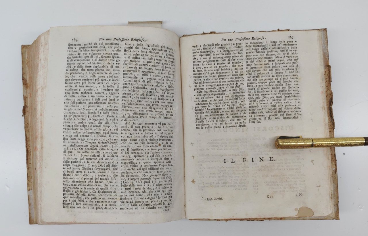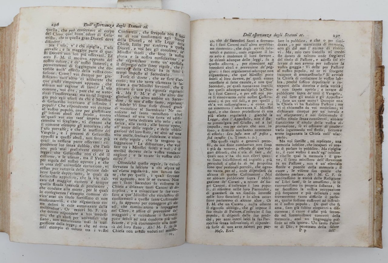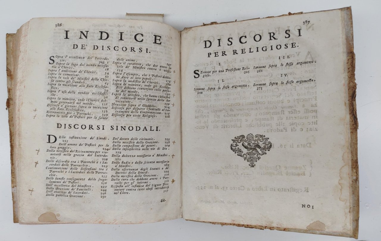 legatura rigida in mezza pelle con piatti cartonati in condizioni accettabili con aloni e macchie, dorso in pelle con etichetta di catalogazione e tassello con il titolo leggermente sbiadito, alcune lievi mancanze, tagli spruzzati in rosso impolverati quelli superiori, rotture all'unghia delle pagine, seconda di copertina con ex-libris e alcune lievi macchie, interno in discrete condizioni, testatine dei capitoli xilografate, alcune macchie alle pagine interne che non vanno a disturbare la lettura, numero pagine 387