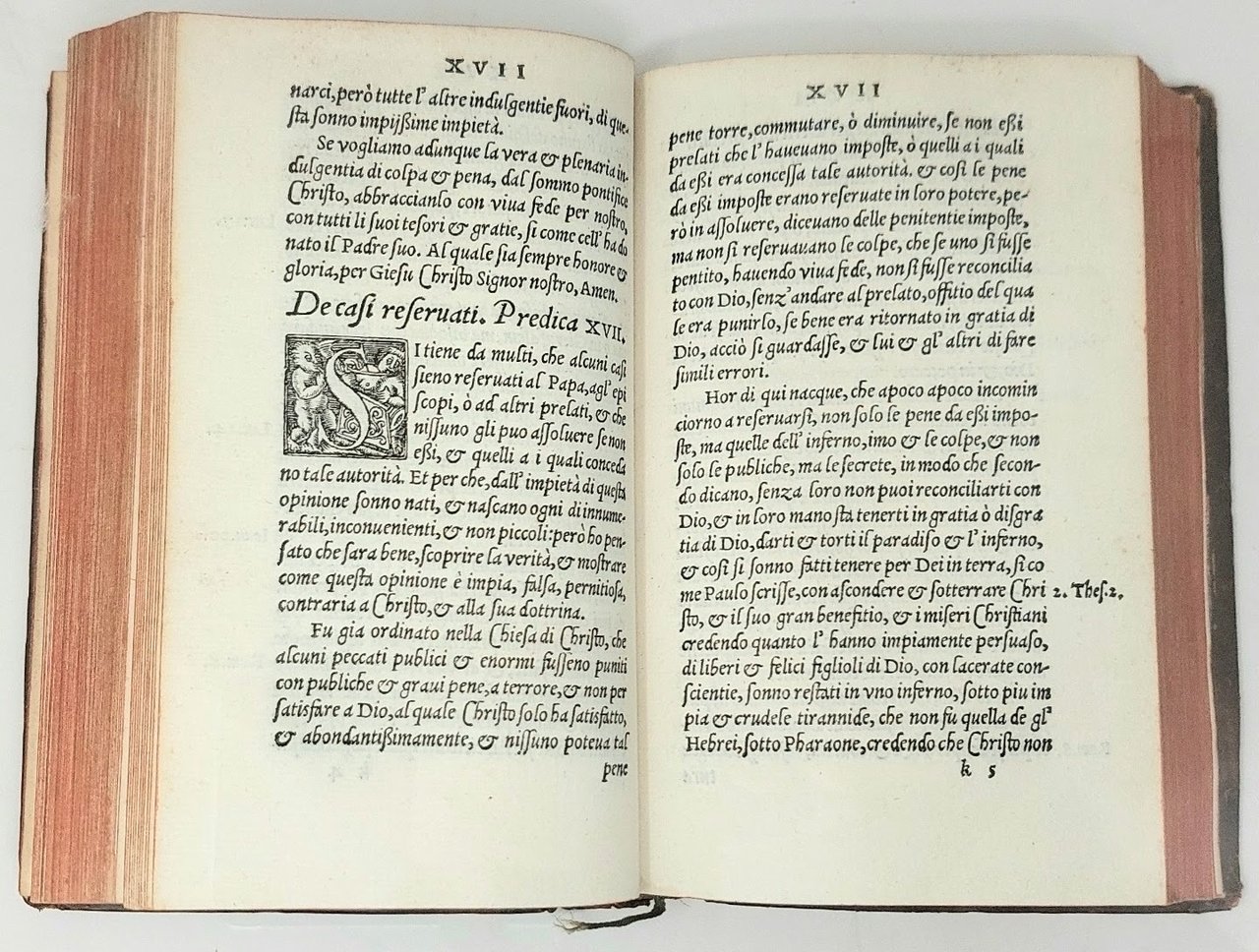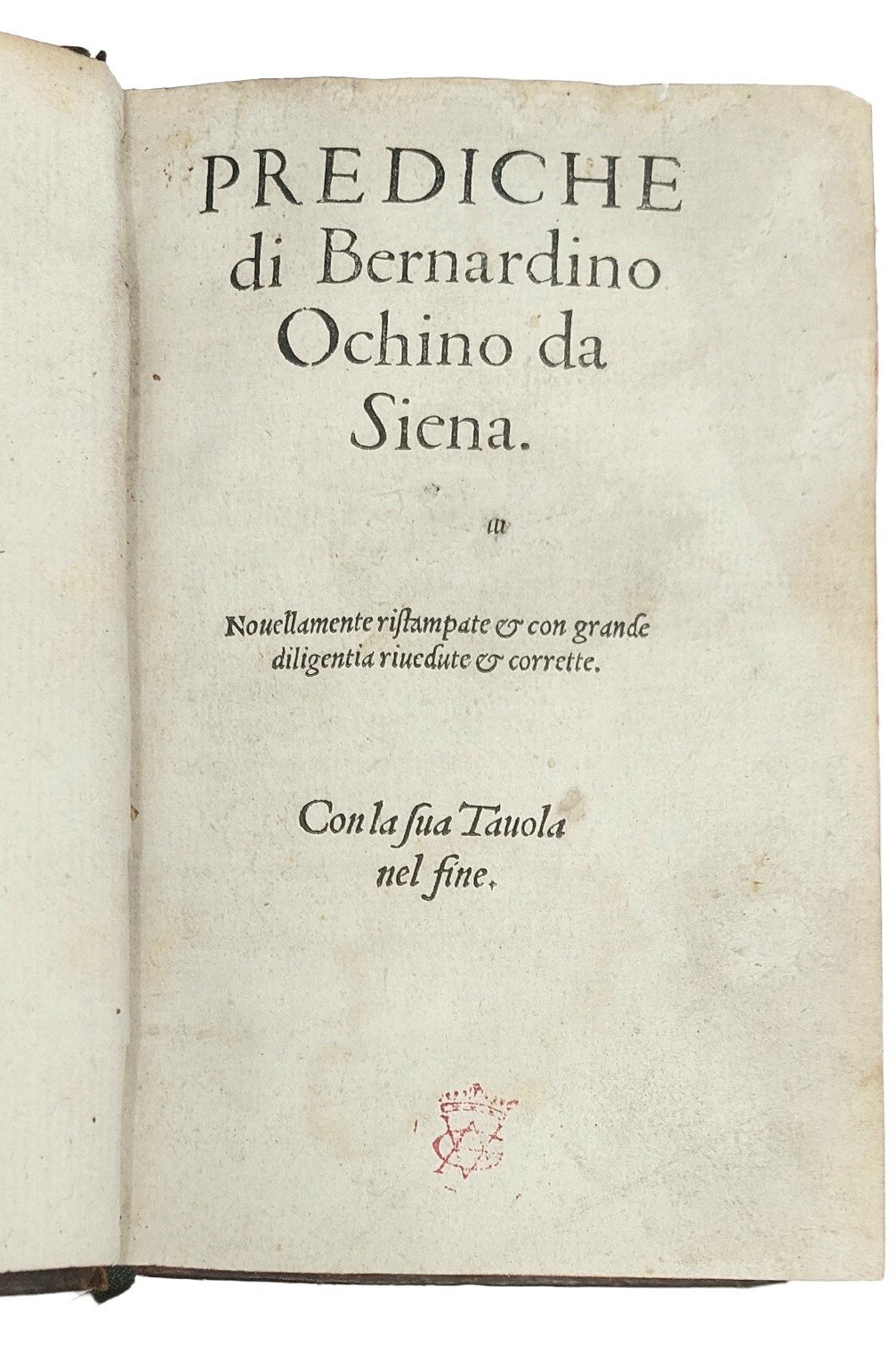 >in-8, (mm 144x91) ff (216). La carta b1 è postposta a c8. Legatura piena pelle settecentesca, ricchi fregi e titolo oro su duplice tassello al dorso (piccola mancanza all'angolo inferiore del piatto anteriore). Prima parte delle prediche dell'Ochino stampate a Basilea da Pietro Perna. Nel catalogo di Leandro Perini, La vita e i tempi di Pietro Perna, Roma, Edizioni di Storia e Letteratura, 2002, l'opera risulta al n. 1. Stampata dal Perna, con ancora la presenza dell'Isingrinus. Alla dedica al lettore: "In Christo fratello Bernardino Senese, alli pij, candidi et sinceri Lettori S.", seguono le 50 Prediche. Esemplare fresco e ben conservato, al foglio di titolo sono presenti tracce di polvere e piccolo timbro rosso con monogramma di antica collezione privata. Perini, cat. Perna n. 1.