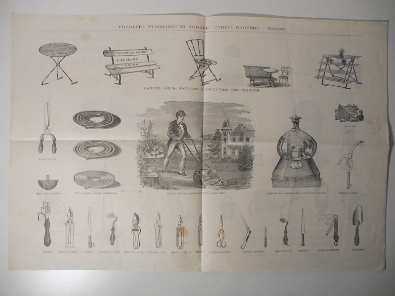 Pieghevole di 4 facciate (ciascuna misura cm 24 x 32), piega nel mezzo, lievi aloni. Illustrazioni raffiguranti varie tipologie di attrezzi per orti e giardini venduti da questa ditta torinese. Pieghevole non datato ma risalente al 1890 circa.
