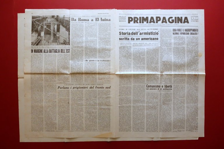 Giornale, cosa vuole il raggruppamento nazionale repubblicano socialista?" in "Primapagina" panorama periodico della vita e della stampa supplemento periodico alla "Gazzetta dell'Emilia" numero 2 Modena, 21 febbraio 1945 Modena - 1945; cm 50x35; pp. 8 con qualche ill. in b/n; esemplare a fogli sciolti. Numero completo. Condizioni di conservazione Buone condizioni con tracce d'uso, normali pieghe per conservazione, alcune piccole leggere bruniture, pagine 7-8 con un paio di minuscole mancanze che non impediscono la comprensione del testo (vedi foto). L'articolo di cui sopra, completo, è una sorta di programma del raggruppamento. Numero completo. SC03.D18529 N "