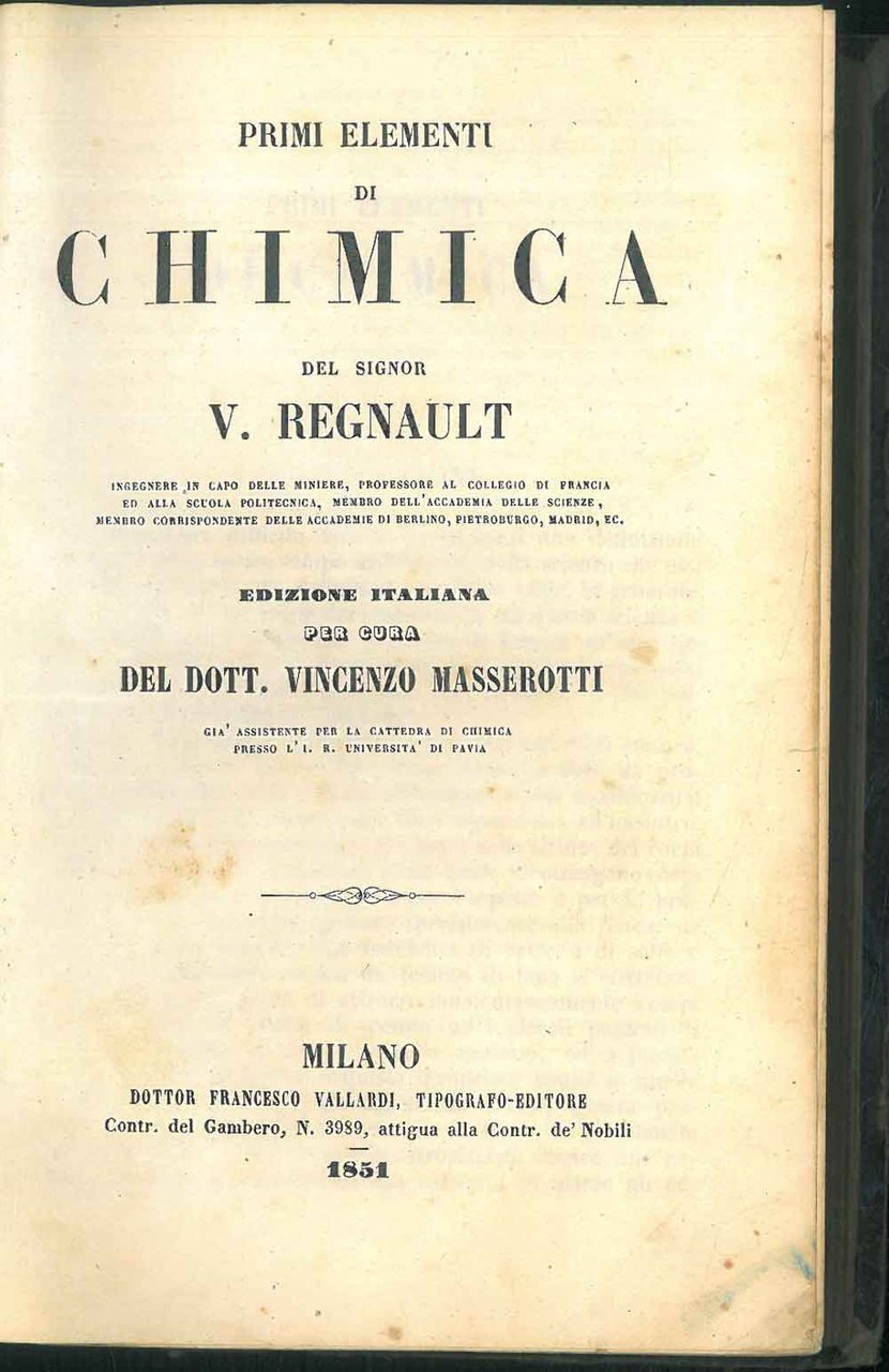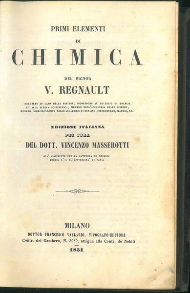 Primi elementi di chimica del Signor V. Regnault. Edizione italiana per cura del Dott. Vincenzo Masserotti