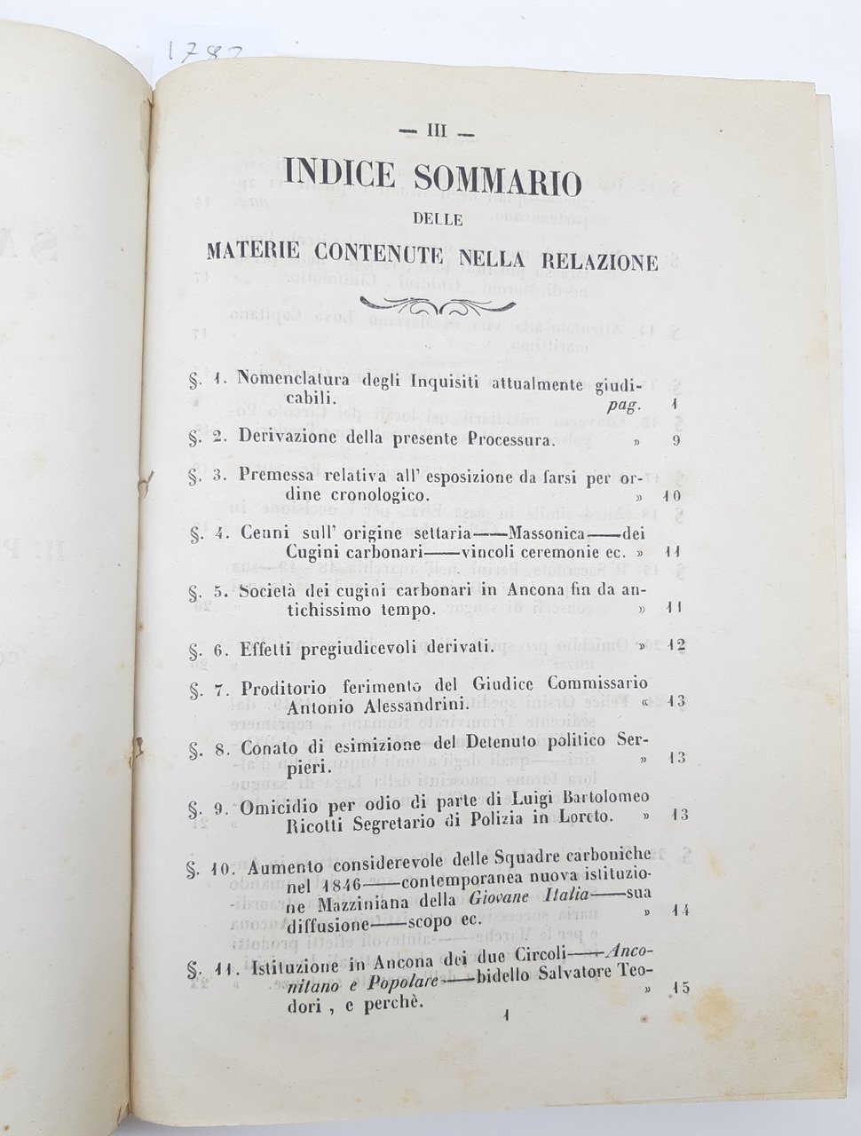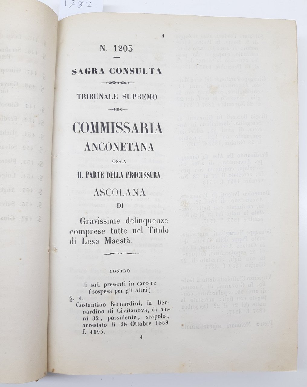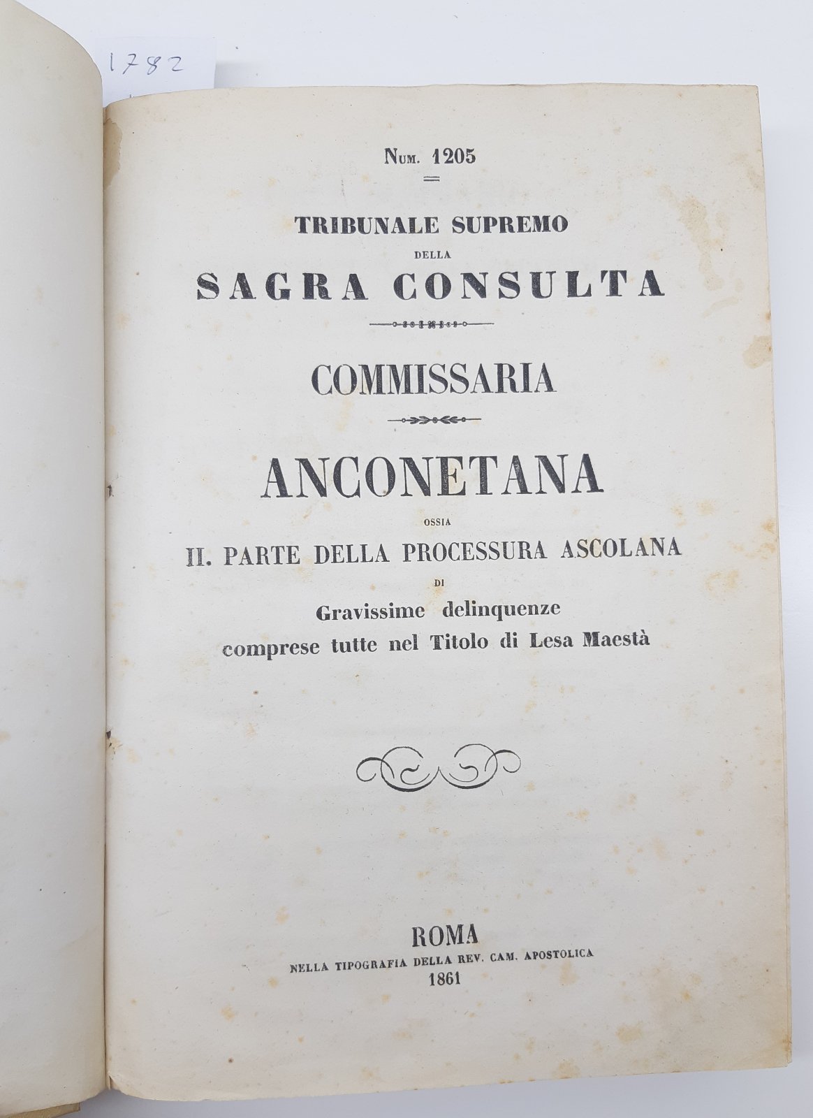 Tribunale supremo della Sacra consulta commissaria anconetana ossia seconda parte della processore a Ascolana di gravissime delinquenze comprese tutte nel titolo di lesa maest‡ Roma tipografia Apostolica 1861