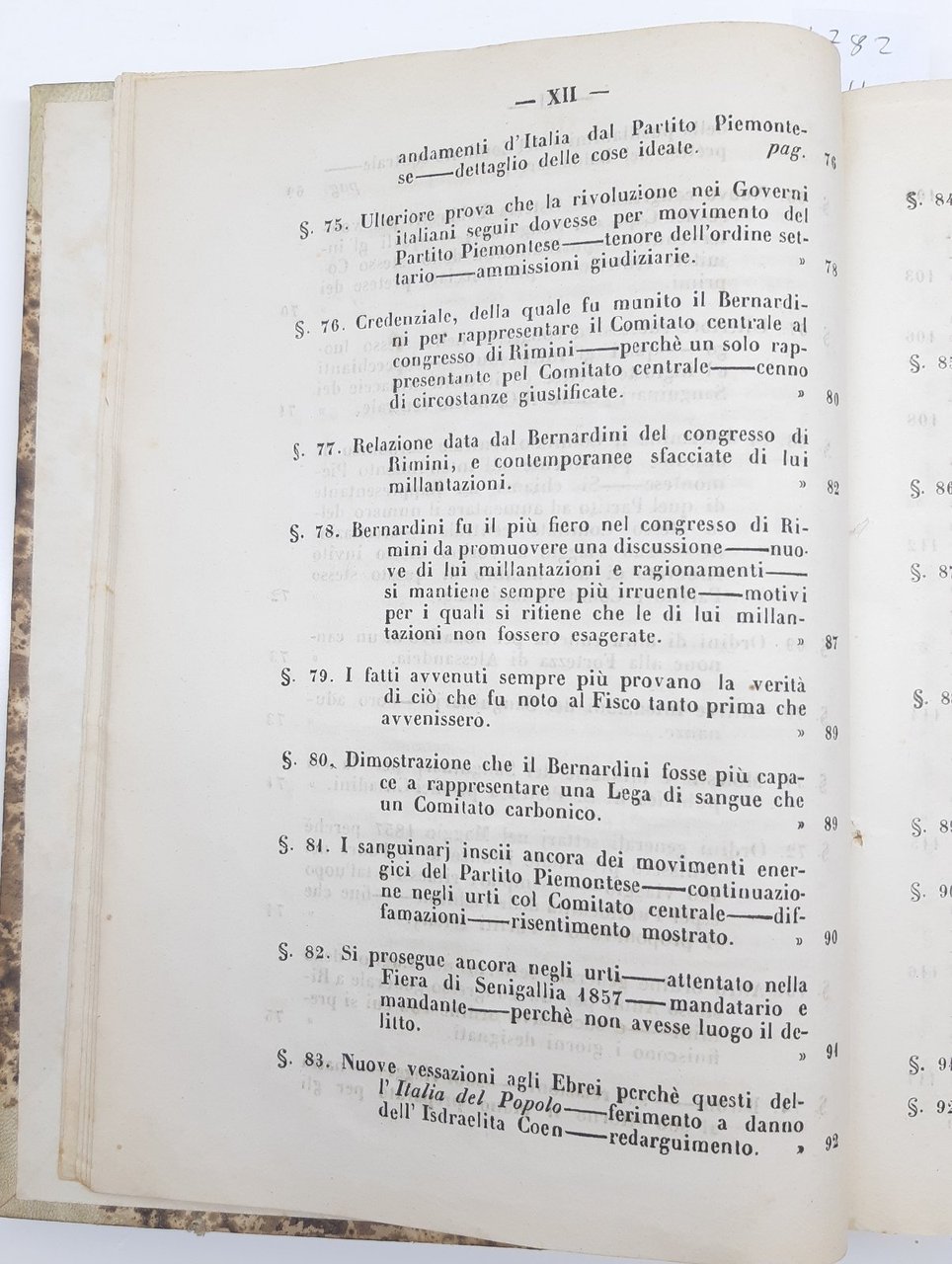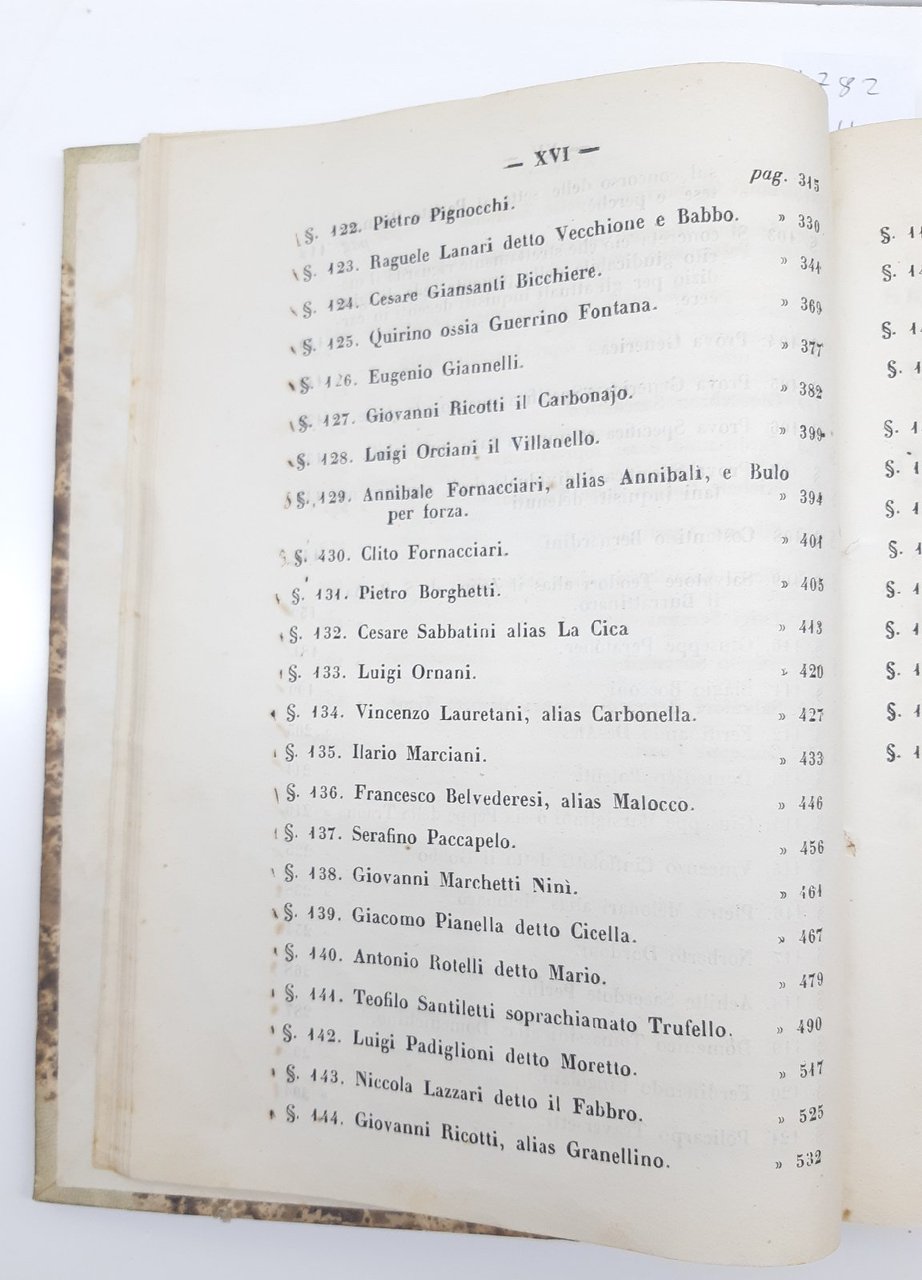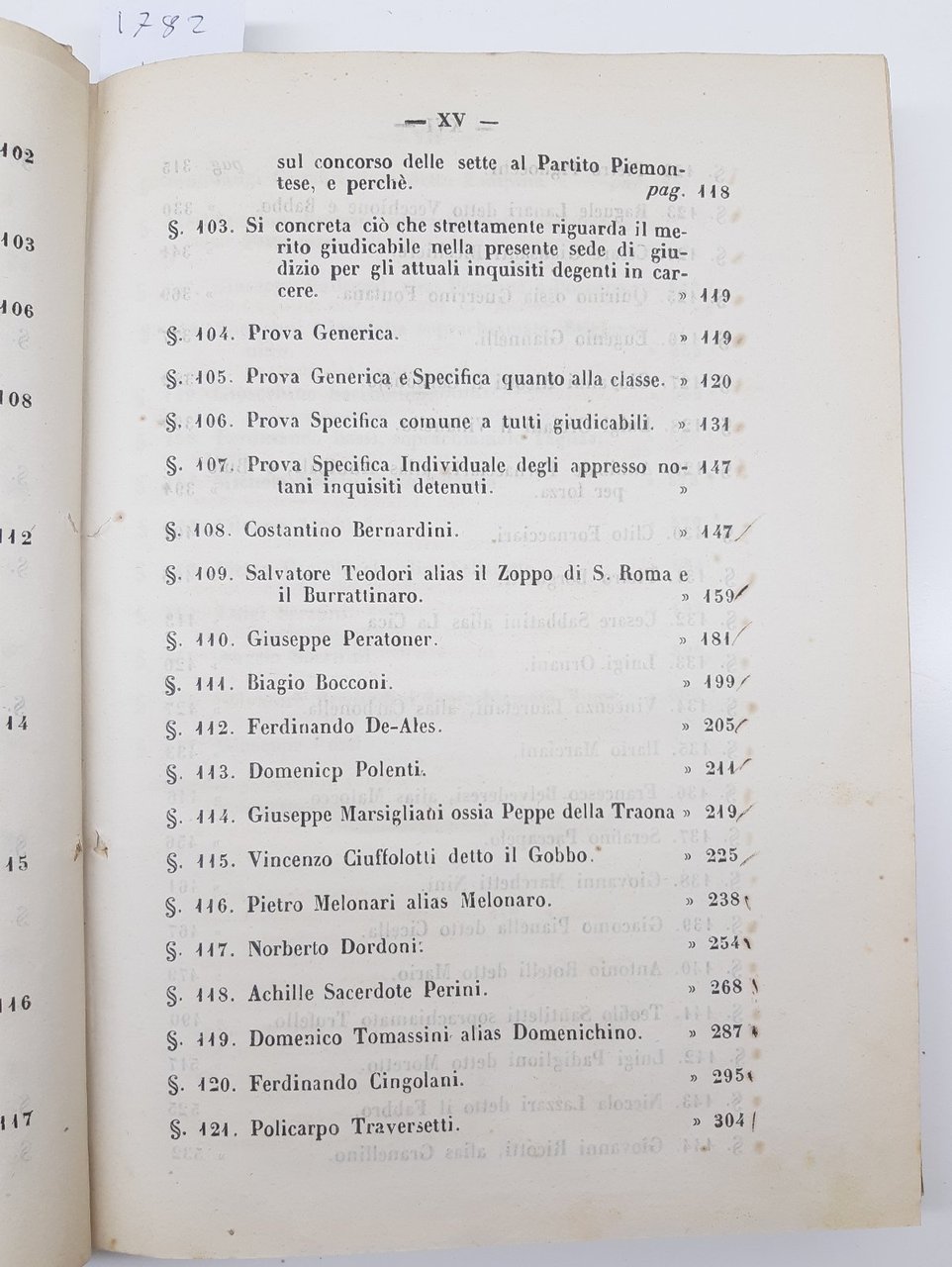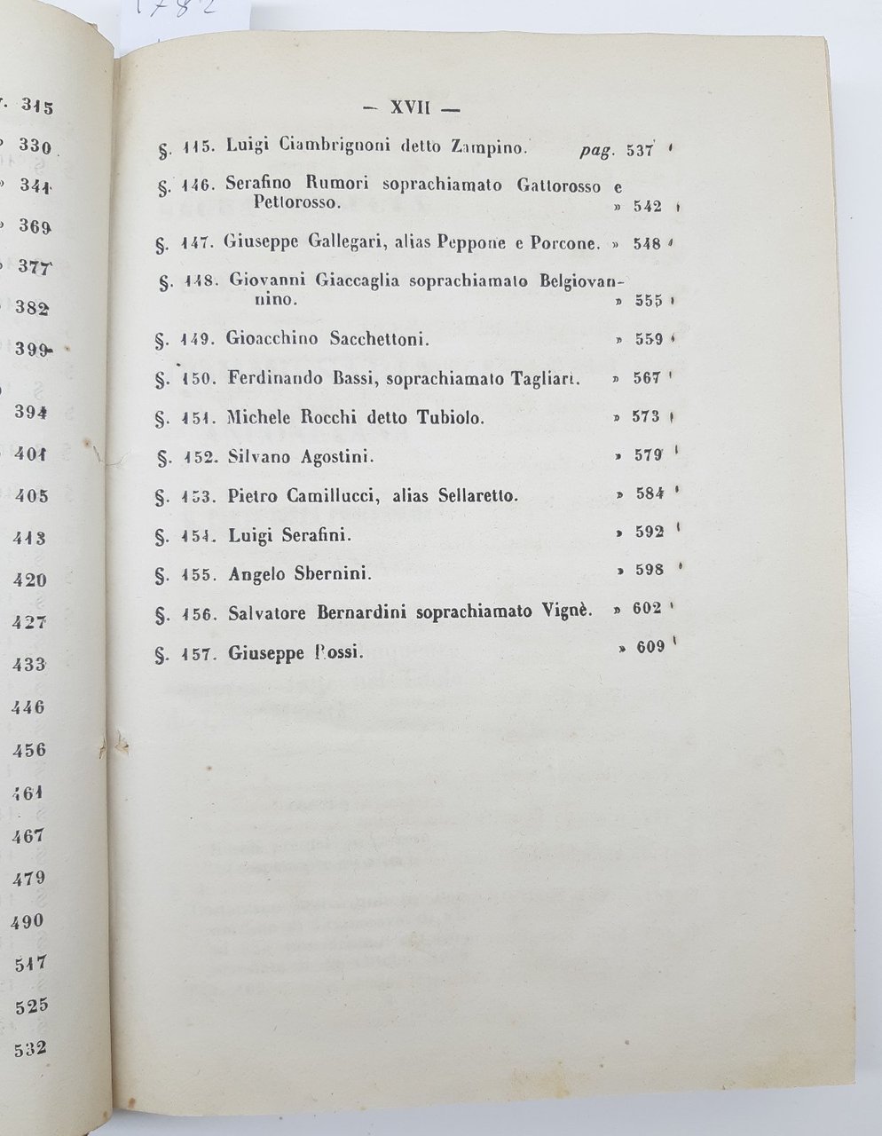 Testo sui crimini commessi durante il periodo che portÚ alla dissoluzione dello stato pontificio e all'unit‡ d'Italia, all'epoca della pubblicazione del presente volume lo stato pontificio possedeva ancora tutto il Lazio, che perse nel 1870 con la presa di porta pia. Di grande importanza storica e documentaria, il volume raccoglie 49 relazioni dettagliatissime su altrettanti condannati di vari reati compresi gli omicidi. Edito nell'anno dell'unit‡ d'Italia da parte della camera apostolica.