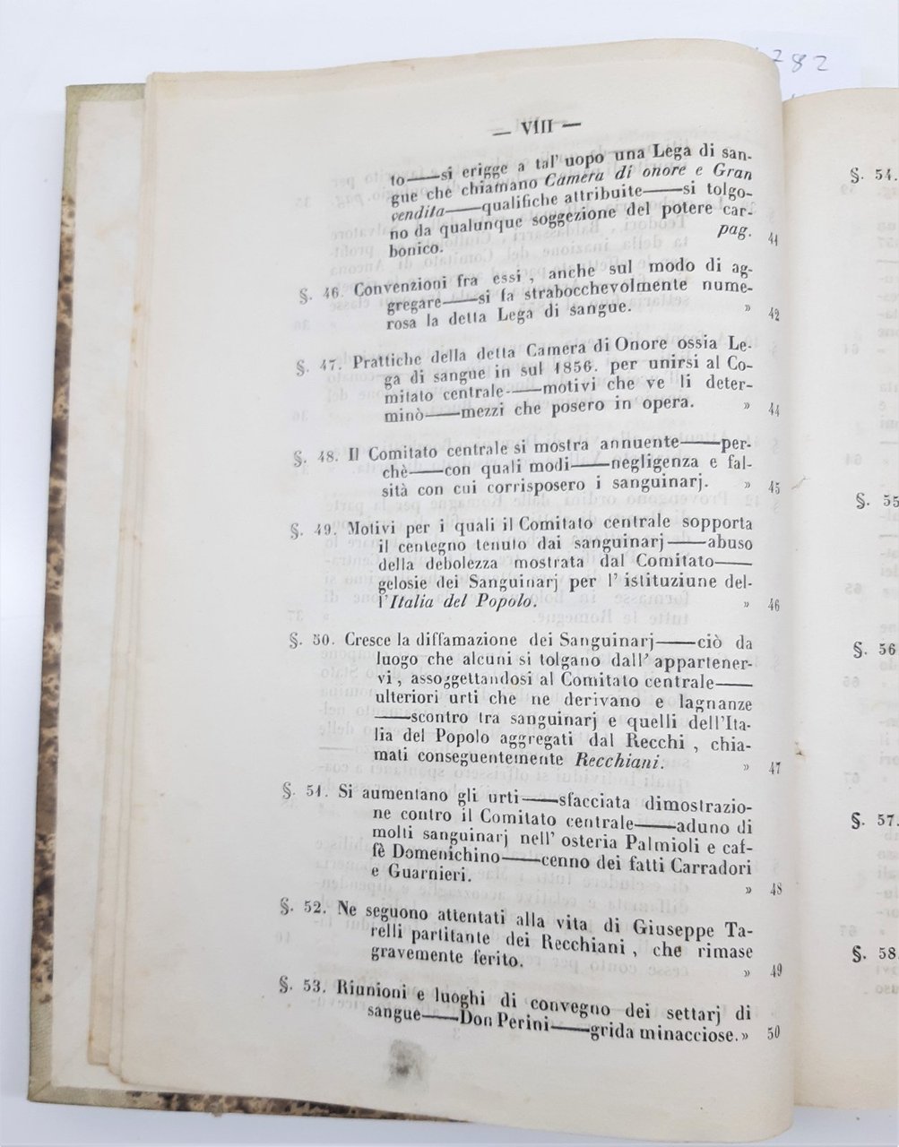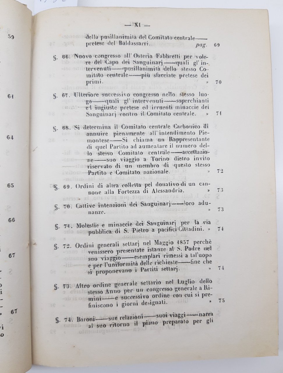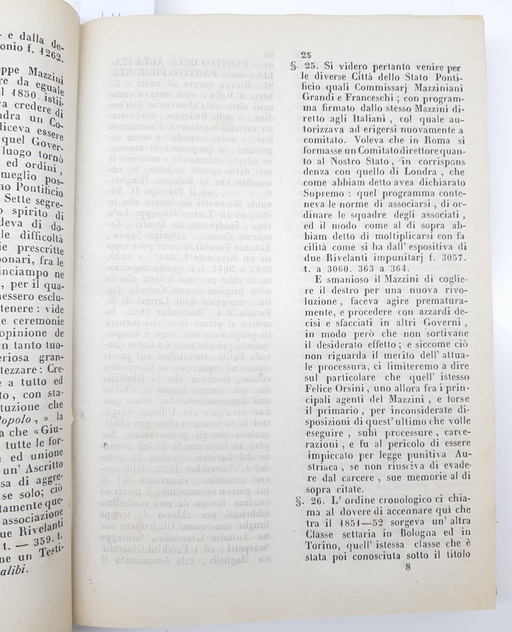 Testo sui crimini commessi durante il periodo che portÚ alla dissoluzione dello stato pontificio e all'unit‡ d'Italia, all'epoca della pubblicazione del presente volume lo stato pontificio possedeva ancora tutto il Lazio, che perse nel 1870 con la presa di porta pia. Di grande importanza storica e documentaria, il volume raccoglie 49 relazioni dettagliatissime su altrettanti condannati di vari reati compresi gli omicidi. Edito nell'anno dell'unit‡ d'Italia da parte della camera apostolica.