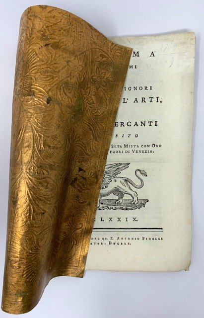 >Opuscolo in-8 (mm 170x230), pp. 12 con impresa del Leone Marciano al titolo, due testatine e qualche capolettera, in elegante brochure in carta coeva, dorata e goffrata con decori impressi con alternanza di superfici dorate incavate e in rilievo con grandi fiori e zucche. Curioso editto relativo alla produzione autarchica ed il commercio di tessuti in broccato e tessuti pregiati in seta mista a oro ed argento fabbricati fuori dal territorio veneziano. La preziosa copertina rende questo editto un oggetto non comune , in ottimo stato e di rara raffinatezza.