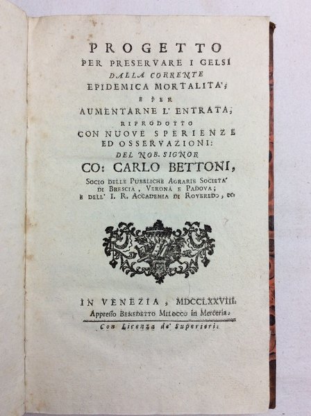 In-16 gr. (mm. 191x117), mz. pelle con angoli, titolo oro su tassello al dorso (abras.) pp. (2),VII-XVI,102.Carlo Bettoni (1725-1786), sperimentatore e riformatore agricolo, fondò nel 1768 l'Accademia Agraria.. La mortalità dei gelsi, che si diffuse largamente nelle province venete dopo il 1770 mettendo in pericolo il normale sviluppo dell'industria serica, vide il B. combattere una sua piccola battaglia tecnica.., cosi' Diz. Biografico Ital.,IX, pp. 770-71.A pagina 15 piccolo foro che intacca una parola del testo, altrimenti esemplare molto ben conservato.