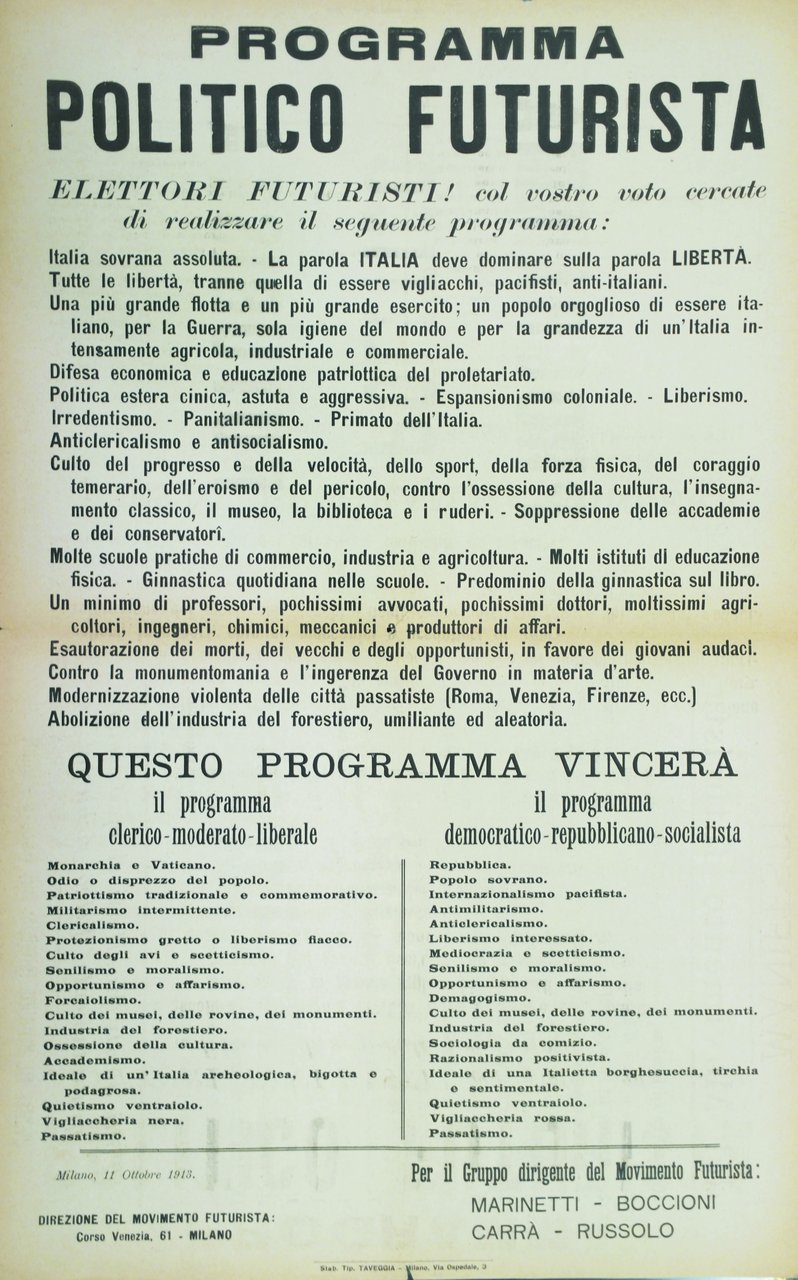 In-4 p. (mm. 295x230), volantino a doppia pagina, titolo al verso, con anche elenco dei 19 Manifesti del Movimento futurista.. Questo programma vincerà il programma clerico-moderato-liberale - il programma democratico-repubblicano-socialista. "Prima edizione", in formato grande.Cfr. Tonini I manifesti del Futurismo Italiano, p. 47, n. 66.1: Pubblicato in occasione delle elezioni politiche del 1913 svoltesi il 26 ottobre (1° turno) e il 2 novembre (ballottaggi) - Salaris, p. 84.Con ingialliture, tracce di scotch alla piega e picc. strappi, ma buon esemplare.