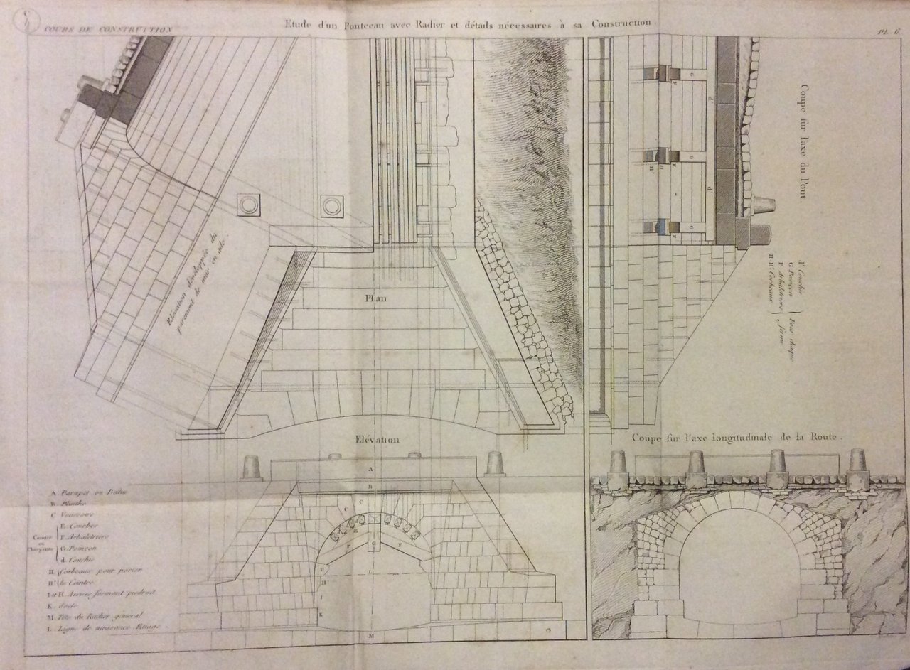 In-8 gr. (mm. 256x196), mz. pelle coeva, fregi e titolo oro al dorso (picc. mancanza), pp. 296, con 9 tavole inc. in rame e fuori testo, di cui 8 più volte ripieg.L'opera è divisa in tre parti: Diverses espèces de matériaux qui entrent dans la construction des édifices - Applications à la construction des routes et des ponts - Application aux ouvrages relatifs à la navigation et aux ports de mer, con una Appendice: Poussée des voutes et poussée des terres.Con qualche fiorit. e alone; fori di tarlo al margine interno su circa 15 carte, ma complessivam. discreto esemplare.