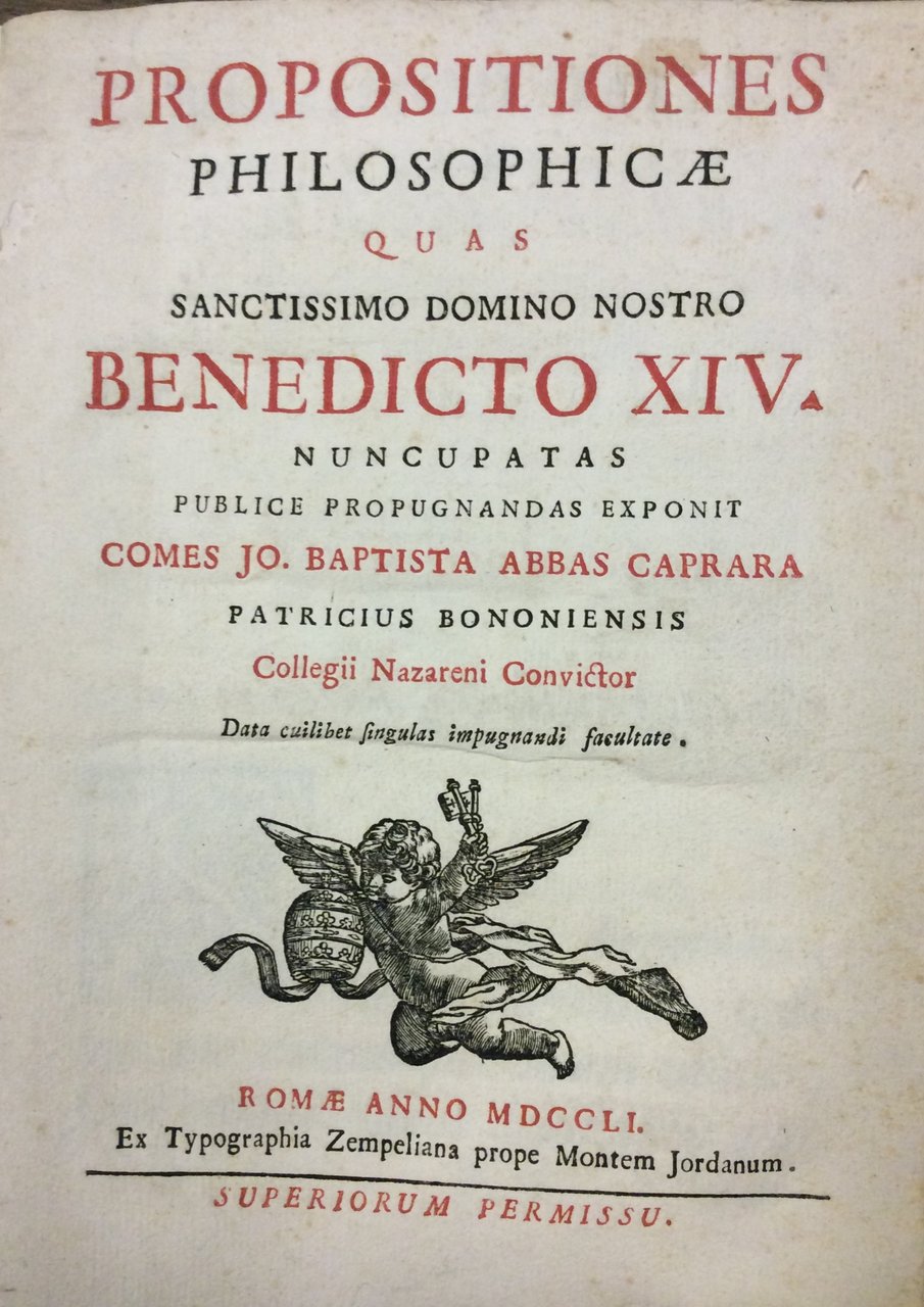 PROPOSITIONES PHILOSOPHICAE QUAS SANCTISSIMO DOMINO NOSTRO BENEDICTO XIV. - Nuncupatas publice propugnandas exponit comes Jo. Baptista Abbas Caprara patricius Bononiensis Collegii Nazareni convictor, data cuilibet singulas impugnandi facultate.