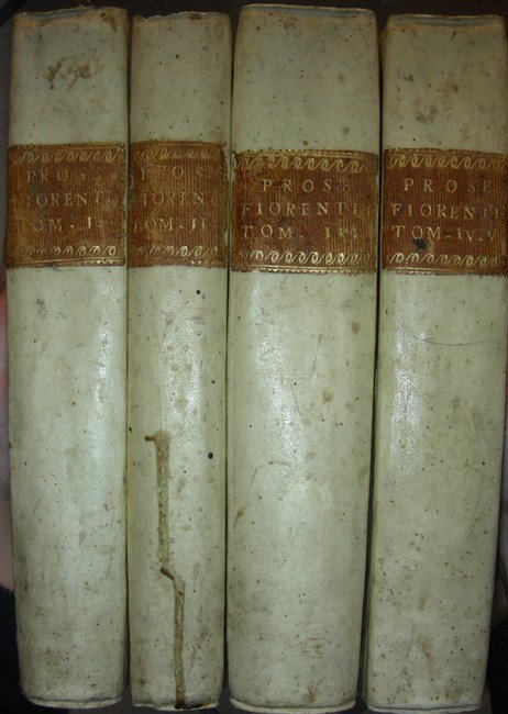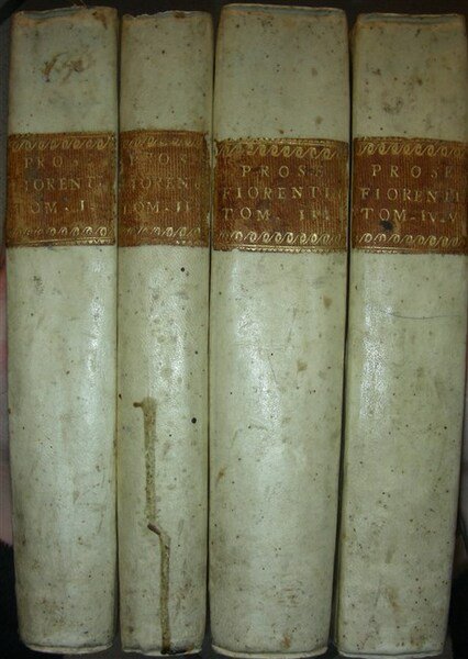 5 parti in 4 voll. in-4 picc., pp. (32), 159, (18), 101, (22), 145, (32), 159, (18), 3-101, (22), 145, (18), 122, (50), 100, (14), 126; XX, 156, XVI, 143, XXVIII, 168, VIII, 160, leg. m. perg. coeva con angoli, tass. e tit. oro ai d., piatti in carta marmorizz. Ai front. bella e gr. vignetta in rame. Iniziali xilogr. E' la raccolta, curata dal filologo fiorentino Carlo Dati (1619-1676), di lezioni, orazioni e cicalate, di diversi autori appartenenti alla celeberrima Accademia della Crusca. Il progetto dell'opera fu interrotto per la morte dell'A., e poi ripreso e proseguito da altri accademici fino alla stesura definitiva in questa edizione veneziana, la più completa. Si aggiunse un sesto vol., nel 1743, contenente le poesie giocose. Bell'esempl. a pieni margini. [173]