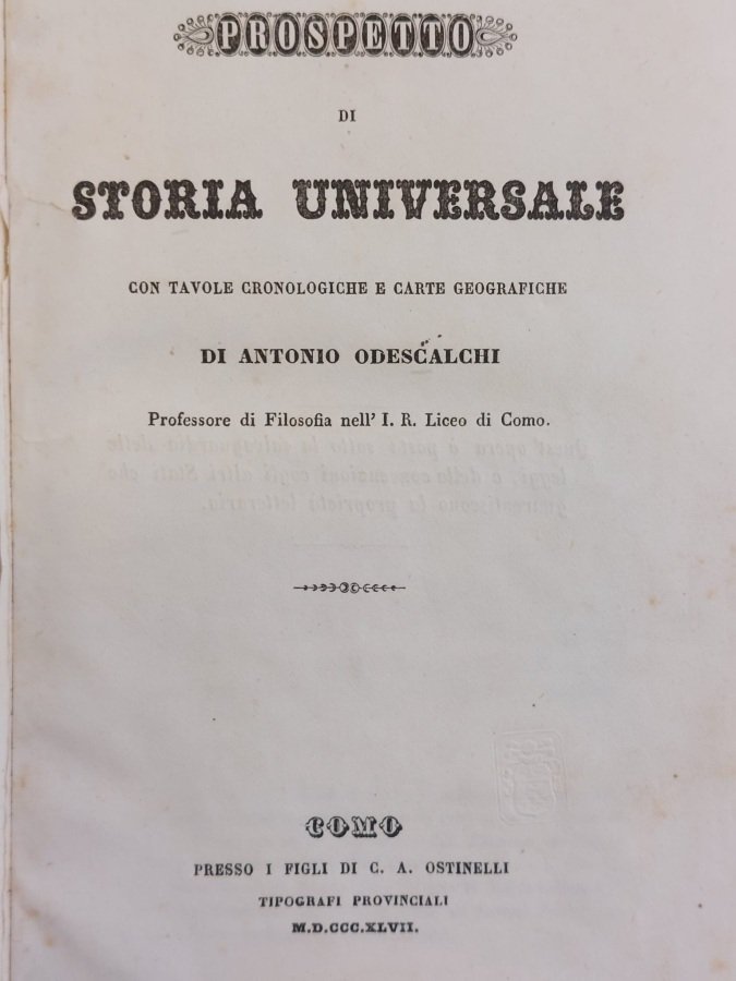 In-8° (cm. 19,7), legatura successiva in tutta tela verde con titolo in oro su tassello nero applicato al dorso (lievissime tracce d'uso); pp. XII 135 [3] in buono stato (lievi fioriture sparse). Con numerose tavole cronologiche nel testo e 3 belle carte geografiche più volte ripiegate fuori testo in fine. Prima edizione di questo testo di Odescalchi, professore di Filosofia nell'I. R. Liceo di Como (oggi Liceo Volta), pubblicato a Como. Antica nota di possesso al foglio di guardia posteriore. Buon esemplare. (NC4)