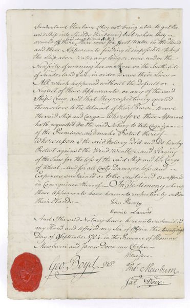 2 pp. on bifolium. With red wax seal. Folio. Statement made by the two shipwrecked Aberdeen mariners John Harvey and Daniel Lamond before George Boyd, the Notary Public of Sunderland, detailing how they lost their vessel and cargo off Sunderland Pier in a storm: "[.] these Appearants set sail with the said ship [the 'Peggy'] from Alemouth in Scotland [i.e., Alnmouth, Northumberland] on the 27th Day of September instant about one o'Clock P.M. staunch and in good Condition, and well manned, with a Cargo of Wheat on board, and proceeded with the said Ship to Newbiggen in the County of Northumberland, when about 4 o'Clock P.M. the Sea raged very high, and the said Ship sprung a Leak [.] the water still increasing upon them, they could with the greatest Difficulty keep the said Ship above water; - when the said Ship arrived off Tynemouth Castle, these Appearants let go the Anchor of the said Ship, but the Sea, still continuing to rage with great violence, they were under the Necessity of cutting the Cable [.] these Appearants endeavored to run the said Ship for Sunderland Harbour, (they not being able to get the said Ship into Shields Harbour) but when they arrived off there (viz. about 5 o'clock A.M.) there was six feet of Water in the Hould and these Appearants finding it impossible to keep the Ship above Water any longer, were under the Necessity of running her on Shore on the South-side of Sunderland Pier, in order to save their lives [.]". - While little is known of John Harvey, Daniel Lamond later entered the Royal Navy and died in the Battle of Copenhagen on 2 April 1801, one of the nine officers and 103 men of Captain James Walker's "Isis" killed or wounded when Rear-Admiral Horatio Nelson's fleet defeated the Danish-Norwegian fleet. - Folded and with three drystamps (6d, 6d, 1s) and 8d stamp. Seal cracked. Signed by both mariners and the Notary, counter-signed by his clerks, Thomas Mewburn and James Dove.