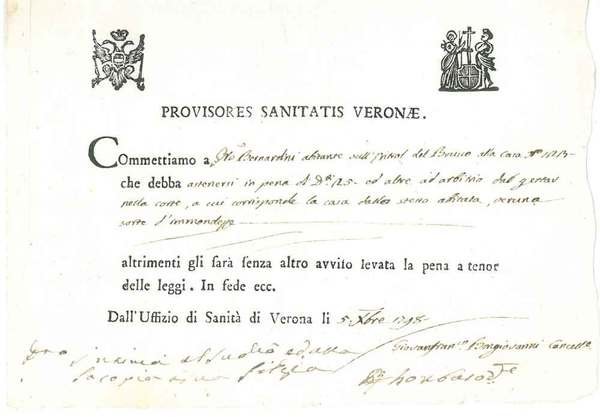 Provisores sanitatis Veronae. Commettiamo a Gio. Bernardini abitante . alla casa n. 123 che debba astenersi . dal gettar nella corte, a cui corrisponde la casa dallo stesso abitata, veruna sorte d'immondezze altrimenti gli farà senza altro avvio leva