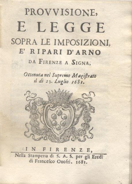 PROVVISIONE, E LEGGE SOPRA LE IMPOSIZIONI, E RIPARI D'ARNO DA FIRENZE A SIGNA. Ottenuta nel Supremo Magistrato il dì 23 Luglio 1681.
