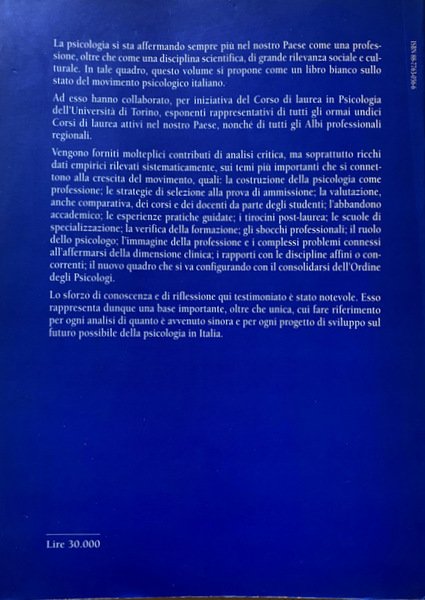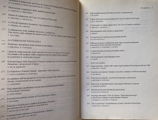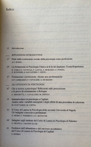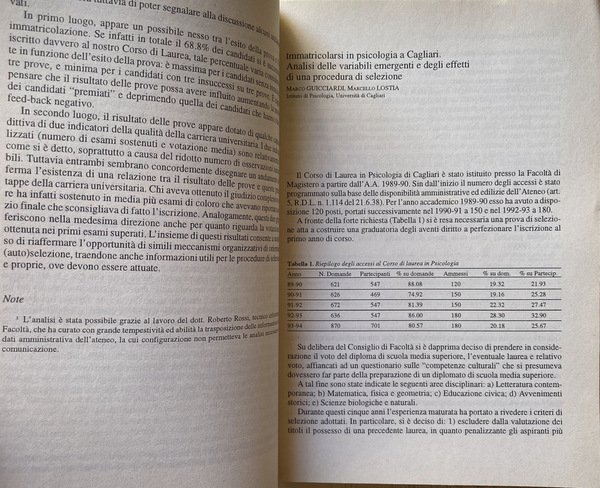 Soggetti: Psicologia, Insegnamento universitario, Educazione, Formazione, Conference paper, Orientamento, Statistiche, Dati, Iscritti, Alunni, Studenti, Curriculum, Professioni, Sbocchi di lavoro, Medicina, Psichiatria, Carriere, Lezioni, Corsi, Cattedre, Finanziamenti, Sud, Nord, Centro, Sardegna, Università, Guide, Manuali, Seminari, Clinica, Esperienze, Esami, Laurea, Immatricolazione, Bologna, Cagliari, Anni Novanta, Selezione, Test, Ingresso, Napoli, Palermo, Abbandono, Successo accademico, Inchieste, Dispersione, Aspettative, Psycho-Epistemic Inventory, Competenze, Biologia generale, Psicologia Fisiologica, Insegnamento a distanza, Tesi, Personale docente, Amministrazione, Segreteria, Burocrazia, Tirocinio post-lauream, Scuole di specializzazione, Psicologo, Mestieri, Libri fuori catalogo, Scienze ambientali, Carcere, Esperienza, Roberto Masini, Riforma penitenziaria, Conferenze, Presidi, Scelta, Perussia, Aule, Dipartimenti, Ricerca, Ricercatori, Fondi, Psychology, University teaching, Education, Training, Orientation, Statistics, Data, Enrolled, Pupils, Students, Professions, Careers, Medicine, Psychiatry, Careers, Lessons, Courses, Chairs, Funding, South, North, Center, Sardinia, University, Guides, Manuals, Seminars, Clinic, Experiences, Exams, Degree, Enrollment, Nineties, Selection, Entrance, Naples, Abandonment, Academic success, Inquiries, Dispersion, Expectations, Skills, General Biology, Physiological Psychology, Distance teaching, Thesis, Teaching staff, Administration, Secretariat, Bureaucracy, Internship, Schools of specialization, Psychologist, Professions, Out of print books, Environmental sciences, Prison, Experience, Penitentiary reform, Conferences, Headmasters, Choice, Classrooms, Departments, Research, Researchers, Fondi, Italy