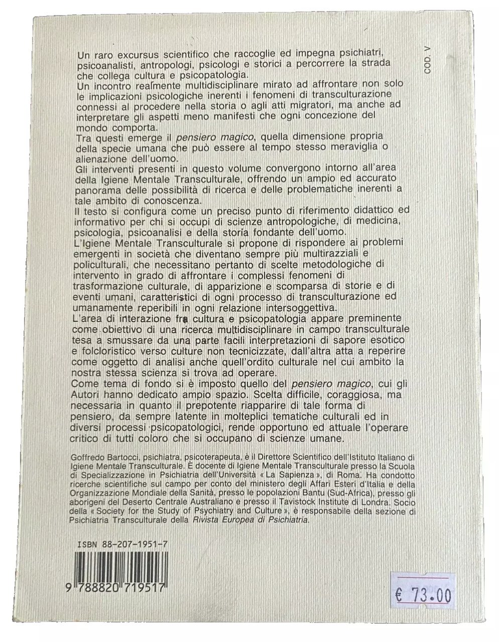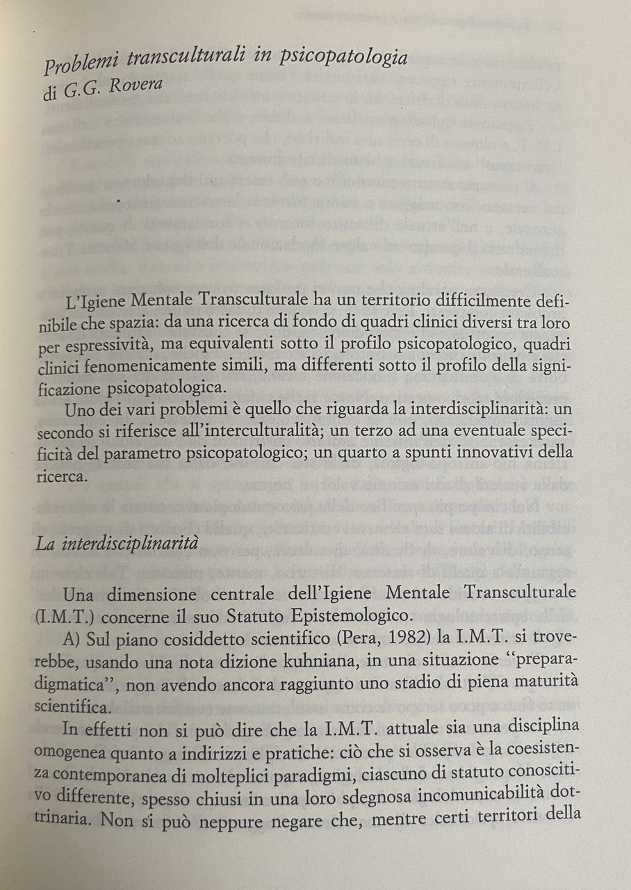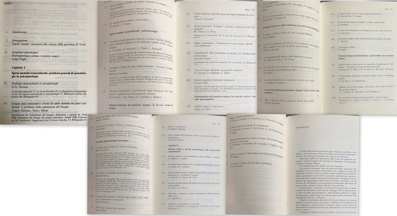 Soggetti: Psicopatologia Cultura Pensiero magico Igiene mentale transculturale Metodologia Problemi Interdisciplinarità Interculturalità Critica Bibliografia Gruppi etnici minoritari Salute mentale Occidentale Valutazione Bisogni Minoranze etniche Letteratura Sviluppo collettivo Emigrati Introduzione Migranti Australia Comunità italo-australiana Epidemiologia Credenze Miti Adolescenti Adolescenza Crescita Trasformazioni Supporto Italia Nuova Zelanda Percezione Servizi Sociali MHLC Questionario Confronti Immigrati Paesi extracomunitari Minori Patologie psichiatriche Terzo Mondo Rappresentazione Terapie Verità Finzione Gioco Rituali terapeutici Possessione Riti Fenomeni paranormali Poltergeist associati Disfunzione Lobo temporale Magia Contromagia Psicoterapia infantile Pazienti Sintomatologia demonologica Etnologia Terapie alternative Neoplastici Tumori Demonologia Pratiche estatiche Himalaya Glossario Canti Bardi nepalesi Sciamanismo Sciamanico Epistemologia Psicoanalisi Conoscenza Culto Banditi Criminalità Aztechi Montezuma Angoscia Resistenza Corvin Aborigeni Deserto Malcolm Kidson Storia Preistoria Società Ambiente Popolazioni Religione Spazio Tempo Organizzazione Discendenza Matrimonio Malattia Morte Spiriti maligni Vita del deserto The Culture of Australian Desert Aborigines Desert Environment Dee People Essence Dreamtime Descent lines The Making of men Malevolent Intenzioni Oggetti Potere Maghi Sacro Antropologia Decessi Segregazione Carcerazione Clinica Percorsi Identità Nostalgia Psichiatria Koro Disturbi Immagine corporea Etnofarmacologia Trichocereus pachanoii Curanderos Peruviani Disagio psichico giovanile Militari Etnie Confronto Indios Yanomami Pigmei Bambuti Zaire Evoluzione Arte Primitivismo Zingari Molise Tradizioni popolari Festa Torino san Giovanni Battista Dolore Sofferenza Delirio Sovrannaturale Miracoli Guarigione Experiences Esperienze Chiesa Streghe Antipsichiatria Mito Benessere Etnocentrismo Islam Freud Immaginario Inconscio Fenomenologia Talismano Personalità Psicopatologia Migrazione Verhexungswahn Influenza Isteria Dialettica Alienazione Istinto Saggi Relazioni scientifiche Papers Riferimento Consultazione Libri rari fuori catalogo Collezionismo Folklore Mitologia Posseduti Primitivismo Medicina Pensiero razionale Mentalità Strutture mentali Interazione Civiltà Lévy-Bruhl Credenze magiche Comportamento Partecipazione Allucinazioni Delirio Relativismo Culturale Psicofarmaci Circolo di Vienna Karl Jaspers Wilson Murdock Durkheim Ernesto De Martino Lévy-Strauss Nicola Abbagnano I.M.Y. Cortés Religioni comparate Sociologia Antropologia Mircea Eliade Jung Malinowski Andrea Flamin Kiev Maffei Zanda Trichocereus Pachanoi Spiritismo Funghi Cactus Vodoo Disturbo Ossessivo compulsivo Evil eye Bound Imu Amok Osman Saleh Sabbe Arcella Mellina Abbandono Origine Cawte Fagioli Frighi Giardina Melanie Klein Lanternari Meggit Rovera Spencer Gillen Meggitt Alcolismo Santillana Armando Lalli Landes Prescott Toynbee Todorov Paure Ancestrali Talismani Hubert Mauss Frazer Bateson Mead Rilke Segal Sonnambulismo Invasamento Sessualità Duomo Feste Molise Karpati Mattei Masciotta Gauguin Van Gogh Foucault Galimberti Etnopsichiatria Sud Bastide Lewis Estatiche Metodo comparativo Xhosa Palo Alto Gregory Bateson von Foerster John Bowlby William James Andrew Hornblow Animismo Littlewood Africani Totem Tabù Psychopathology Culture Magical thinking Transcultural mental health Methodology Problems Interdisciplinarity Interculturality Criticism Bibliography Ethnic minority groups Western mental health Evaluation Needs Minorities Literature Collective development Emigrants Introduction Migrants Italian-Australian community Epidemiology Beliefs Myths Adolescents Adolescence Growth Transformations Support Italy New Zealand Perception Social services Questionnaire Comparisons Immigrants Non-EU countries Minors Psychiatric pathologies Third World Representation Therapies Truth Fiction Play Therapeutic rituals Possession Rites Paranormal phenomena Associated poltergeists Temporal lobe dysfunction Magic Countermagic Child psychotherapy Patients Demonological symptomatology Ethnology Alternative therapies Neoplastic Tumors Demonology Ecstatic practices Glossary Chants Nepalese bards Shamanism Shamanic Epistemology Psychoanalysis Knowledge Cult Bandits Crime Aztecs Anguish Resistance Aborigines Desert History Prehistory Society Environment Populations Religion Space Time Organization Descent Marriage Illness Death Evil spirits Life Intentions Objects Power Magicians Sacred Anthropology Deaths Segregation Relationships Incarceration Clinic Paths Identity Psychiatry Disorders Body image Ethnopharmacology Curanderos Peruvian Youth mental distress Military Groups Comparison Pygmies Evolution Art Primitivism Gypsies Popular traditions Festival Turin Pain Suffering Delirium Supernatural Miracles Healing Experiences Church Witches Antipsychiatry Myth Well-being Ethnocentrism Imaginary Unconscious Phenomenology Talisman Personality Psychopathology Migration Influence Hysteria Dialectic Alienation Instinct Essays Scientific reports Reference Consultation Rare books out of print Collecting Mythology Possessed Primitivism Medicine Rational thought Mentality Mental structures Interaction Civilization Magical beliefs Behavior Participation Hallucinations Delirium Cultural Relativism Psychotropic drugs Circle Comparative religions Sociology Anthropology Spirits Mushrooms Obsessive compulsive disorder Abandonment Origin Alcoholism Ancestral fears Talismans Sleepwalking Possession Sexuality Ethnopsychiatry South Ecstatic Comparative method Animism Africans Taboos Spiritism Collectibles