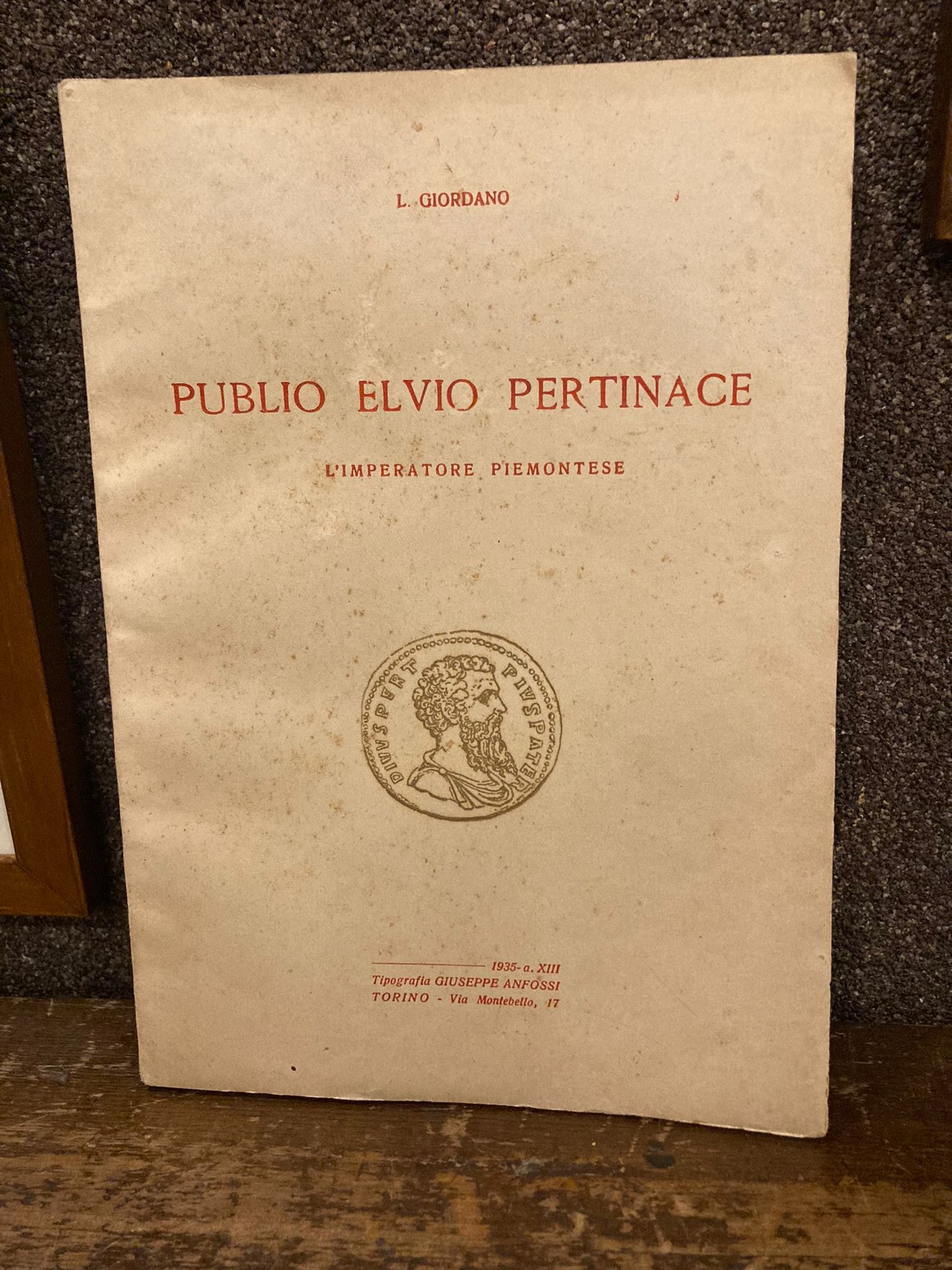 In-8° (24.5x17), pp. IX, 199, (3), brossura editoriale con titoli in rosso al dorso e al piatto anteriore con riproduzione di una medaglia con l'effigie di Pertinace. Più che buon esemplare (qualche macchiolina d inchiostro al piatto posteriore). Edizione originale di questa ricostruzione della biografia di Publio Elvio Pertinace (che era nativo di Alba Pompea), i di lui rapporti con il Cristianesimo, e la figura dell'Imperatore ucciso dai pretoriani nell'iconografia, nell'epigrafia e nella numismatica. Bibliografia Nazionale, 1935, n. 9393.