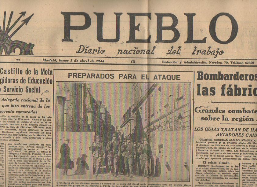 PUEBLO. DIARIO NACIONAL DEL TRABAJO. AÑO V. NUM. 1.160. MADRID, LUNES 3 DE ABRIL 1944.