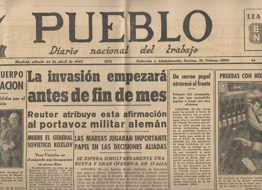 PUEBLO. DIARIO NACIONAL DEL TRABAJO. AÑO V. NUM. 1.175. MADRID, SABADO 23 DE ABRIL 1944.
