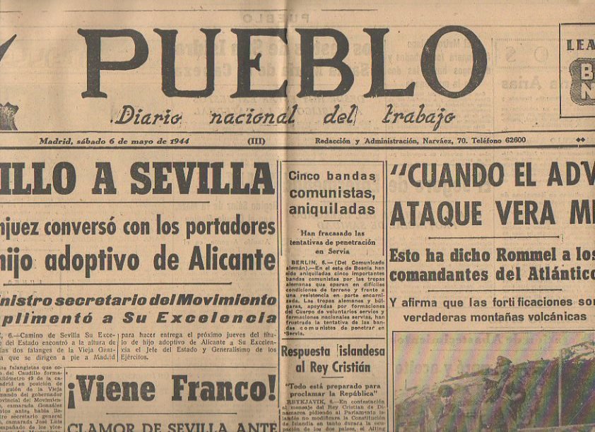 PUEBLO. DIARIO NACIONAL DEL TRABAJO. AÑO V. NUM. 1.187. MADRID, SABADO 6 DE MAYO 1944.