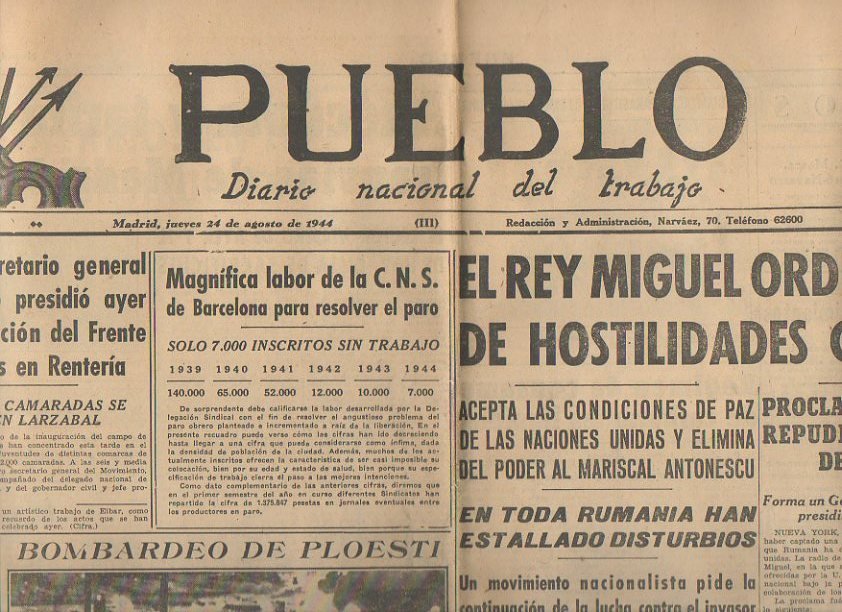 PUEBLO. DIARIO NACIONAL DEL TRABAJO. AÑO V. NUM. 1.281. MADRID, JUEVES 24 DE AGOSTO 1944.