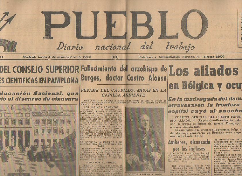 PUEBLO. DIARIO NACIONAL DEL TRABAJO. AÑO V. NUM. 1.290. MADRID, LUNES 4 DE SEPTIEMBRE 1944.