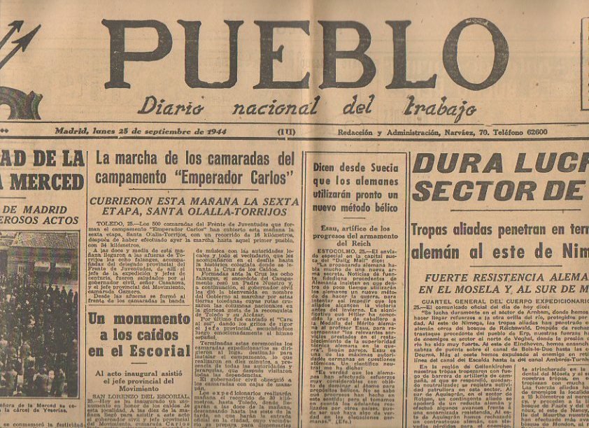 PUEBLO. DIARIO NACIONAL DEL TRABAJO. AÑO V. NUM. 1.308. MADRID, LUNES 25 DE SEPTIEMBRE 1944.