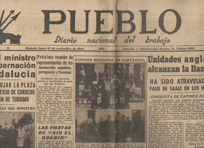 PUEBLO. DIARIO NACIONAL DEL TRABAJO. AÑO V. NUM. 1.463. MADRID, LUNES 27 DE NOVIEMBRE 1944.