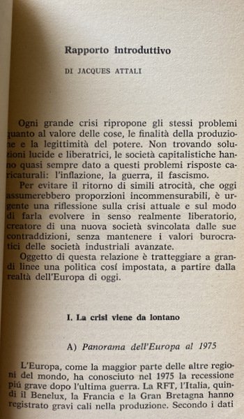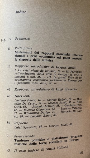 Nella prima parte, Mutamenti dei rapporti economici internazionali e crisi economica nei paesi europei, le relazioni di Attali e Spaventa, ricca di dati e analisi la prima e fitta di provocazioni critiche la seconda, offrono la base per un problema che coinvolge tutti; e su cui qui si applicano i contributi dal punto di vista economico (De Cecco), sindacale (Lettieri), programmatorio (Ruffolo, Cafagna), economico-politico (Barca, Giannotta), manageriale (Osti), di pratica politica europeista (Olivi, Dorigo).