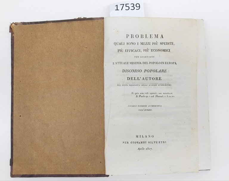 Problema Quali sono i mezzi pi˘ spediti pi˘ efficaci pi˘ economici per alleviare l'attuale miseria del Popolo in Europa discorso Popolare dell'autore Milano Silvestri 1817