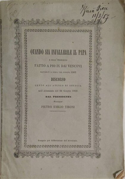 QUANDO SIA INFALLIBILE IL PAPA e dell'indirizzo fatto a Pio IX dai Vescovi raccolti a Roma nel giugno 1862. Discorso letto all'Ateneo di Brescia dal Presidente. Canonico dellaCattedrale di Brescia.