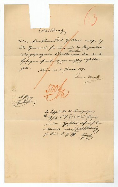 1 S. Folio. Quittung über 500 Gulden, "welche ich als Honorar für eine am 30. Dezember 1869 gesungene Rolle Martha von der k. k. Hoftheaterncassa richtig erhalten habe [.]". - Die Tochter eines österreichischen Offiziers besuchte das Konservatorium in Wien und debütierte 1862 in Florenz. Nach wechselnden Engagements in Italien und Spanien sang sie 1831 in Pest, 1832 in Berlin und gehörte seit 1865 dem Ensemble der Hofoper in Wien an. Die wegen ihrer Ausstrahlung und Stimmgewalt gefeierte Künstlerin wirkte später in Amerika, bis sie 1888 nach Europa zurückkehrte, wo sie sich das Leben nahm. - Mit Gegenzeichnung sowie einigen Notizen von alter Hand in Rotstift.