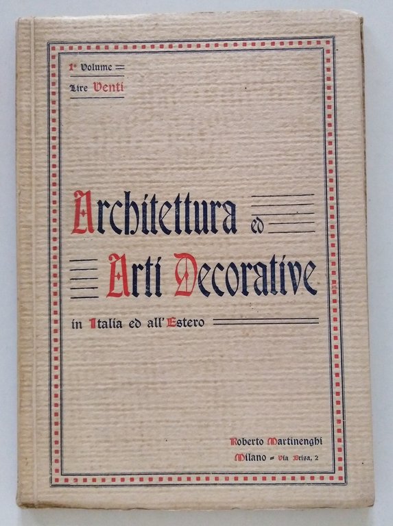 R. Martinenghi, Architettura e Arti Decorative in Italia ed all'estero Volume 1 (Otto Wagner, Hoffmann, Kos, Bauer) R. Martinenghi, Milano s.d. (anni '15-'20 c.a.); cm. 25x17.5, pp. 108; volume 1°, con ill. in b/n a p.pag.; bel repertorio d'epoca coeva arti decorative-architettura moderna, opere degli architetti: Otto Wagner, Hoffmann, Kos, Bauer; br. ed. Condizioni di conservazione Esemplare in buono stato con leggere tracce d'uso; brossura editoriale con leggere fioriture. SETT144.L14336 MT