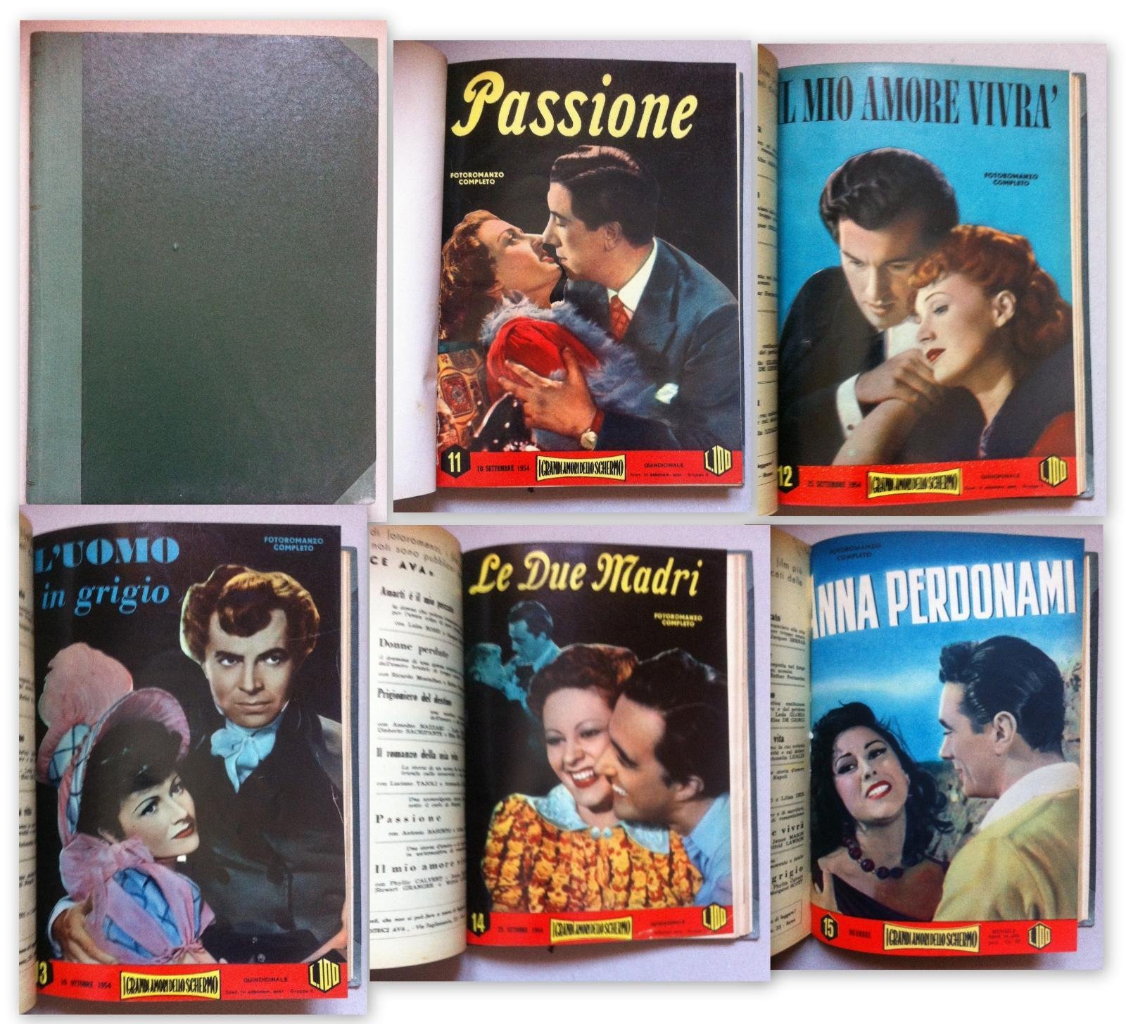 RACCOLTA DI 5 CINEROMANZI GRANDI AMORI DELLO SCHERMO 1954 N. 1 PASSIONE CON LILIANA DEIS, ANTONIO BASURTO, MARIA GRAZIA FRANCIA N. 2 IL MIO AMORE VIVRA' CON PHILLIS CALVERT, STEWART GRANGER, JAMES MASON, JEAN RENT N. 3 L'UOMO IN GRIGIO CON MARGARET LOCRWOOD, PHILLIS CALVERT, STEWART GRANGER, JAMES MASON, N. 4 LE DUE MADRI CON VITTORIO DE SICA, MARIA DENIS LYDIA JOWNSON N. 5 ANNA PERDONAMI CON ALDO FIORELLI, MARIA FRAU, CESARE FANTONI, ALBERTO SORRENTINO COPERTINA RIGIDA CON PIATTI IN SIMILPELLE VERDI, ANGOLI E DORSO IN TELA ALCUNE MACCHIE E GRAFFI AL PIATTO ANTERIORE E AL DORSO, FOGLI DI GUARDIA BIANCHI CON LIEVI FIORITURE, ALL'INTERNO 5 FOTOROMANZI QUINDICINALI CON COPERTINA A COLORI, MARGINI RIFILATI (VEDERE IMMAGINI), TAGLI IRREGOLARI, ALCUNE LIEVI E PICCOLE FIORITURE AI TAGLI, LIEVE BRUNITURA AI MARGINI DELLE PAGINE E LIEVI E PICCOLE MANCANZE IN BUONO STATO
