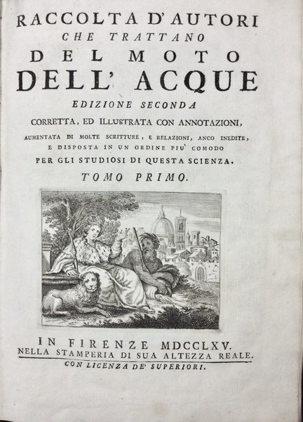 In-8 (mm. 245x175), 9 volumi, p. pergamena coeva, fregi e titolo oro su due tasselli al dorso. 1° vol.: pp. XXXVI,420 con X tavole; 2°: pp. IV,563 con XIX tavole; 3°: pp. IV,516 con IX tavole; 4°: pp. VI,530 + 1 carta di spiegaz. della tav. IV (in fine), con IV tavole; 5°: pp. III,563 con III tavole; 6°: pp. IV,552 con VI tavole; 7°: pp. IV,580 con VI tavole di cui 1 tabella; 8°: pp. XXXII + 1 carta di titolo fra le pp. IV e V,476,LIX con XII tavole; 9°: pp. III,443,58 + 1 carta nn. di annotaz. alla tav. IV del vol., con VII tavole (la II ha un bis Livellazione o Profillo); su ogni frontespizio è inc. in rame una deliziosa vignetta figurata. L'opera è completa, illustrata da 76 tavole complessive fuori testo, più volte ripieg. ed inc. in rame, ciascuna on numerose figure. Tra le tante segnaliamo le seguenti di particolare interesse: Pianta della Fattoria di Bellavista, e altre dimostrazioni fatte nel Padule di Fucecchio, di grande formato, con figure di pescatori ed animali // Topografia del Corso del Po' e delle Acque adiacenti da Piacenza fino al Mare fatta l'anno 1716, con i territori di Parma, Modena, Mantova, Venezia, Bologna, Polesine // Mappa della Diversione dei due Fiumi Ronco, e Montone.., per allontanarli da Ravenna // Pianta delle Paludi Pontine con profilo dimostrante lo scavo da farsi si del nuovo taglio che degli Alvei antichi per deviar l'acque al mare // Disegno d'avviso dell'Adige dalla Chiesa di San Giorgio sino al Ponte delle Navi // Disegno d'avviso dell'Adige da Verona, sino alle Chiaviche Sagramose. "Seconda edizione" di questa importantissima raccolta di opere e memorie sul moto delle acque, molto più ampia della prima edizione del 1723, in 3 volumi (uscita sempre in Firenze per Tartini e Franchi). Vi sono contenute numerosissime scritture di valenti scienziati circa le colmate, arginatura di fiumi, disseccamento di paludi. drenaggi, ingegneria idraulica. Gli autori compresi in questa raccolta sono: Archimede, G. Albizi, Galilei, Castelli, Michelini, Borelli, Montanari, Viviani, Cassini, Guglielmini, Manfredi, etc.Cfr. Riccardi,I,330-331: Le memorie ed opere dei diversi autori inserite in queste pregevoli compilazioni sono riportate sotto i rispettivi loro nomi.Tutta la raccolta è ben conservata.