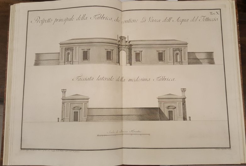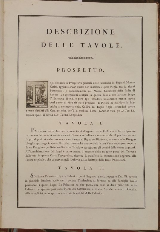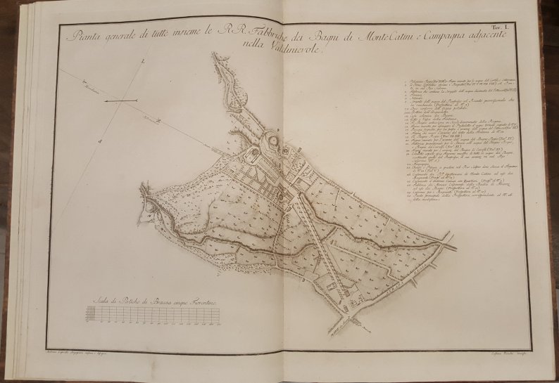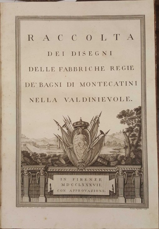 >in-plano (63x82 cm.), legatura posteriore m.pelle. Raccolta completa composta da un titolo fig. inc. con veduta e armi araldiche (Antonio Terreni inventò e disegnò, Gaetano Vascellini inc.), una grandiosa veduta su doppia pag. delle fabbriche e dintorni, XIV tavole di particolari architettonici, (incise da Cosimo Zocchi, Gaetano Vascellini, G.B.Cecchi e Cosimo Colombini dai disegni di Antonio Terreni), 3 fogli a stampa di testo descrittivo. Le Terme di Montecatini vennero ricostruite su progetto di Paoletti tra il 1774 e il1784 su volere ed a spese del Granduca Pietro Leopoldo e dei Benedettini della Badia di Firenze. Il presente magnifico album ne fu il ricordo e la documentazione ufficiale. Esemplare perfetto, a pieni margini. Cfr. Berlin Kat. 2731. Lozzi 2308. Moreni I, 125.