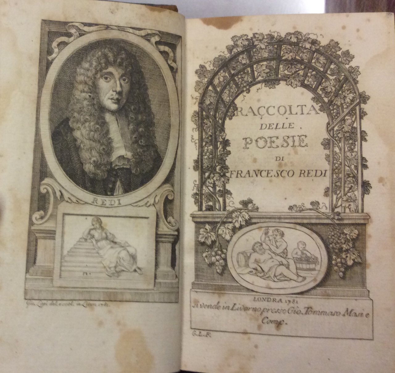In-24 gr., mz. pelle coeva, ricchi fregi e titolo oro su tassello al dorso, pp. (6),XXIX,276, con ritratto dell'A. eseguito da Gio. Lapi e bel frontespizio allegorico racchiuso da cornice, inc. su rame. La raccolta è preceduta dalla Vita di Francesco Redi scritta da Salvino Salvini. Seguono: "Bacco in Toscana. Arianna Inferma. Sonetti. Poesie". In aggiunta alla raccolta: Lettere del signor Francesco Redi appartenenti a cose di Lingua, ed al Dizionario della Crusca. Cfr. Gamba,831 - Prandi "Bibliografia delle Opere di Francesco Redi", p. 20, n. 105. Lieviss. alone marginale sulle prime 10 carte, altrimenti ben conservato.