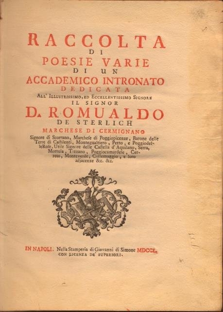 RACCOLTA DI POESIE VARIE DI UN ACCADEMICO INTRONATO. Dedicata all'illustrssimo, ed eccellentissimo signore il signor D. Romualdo de Sterlich.