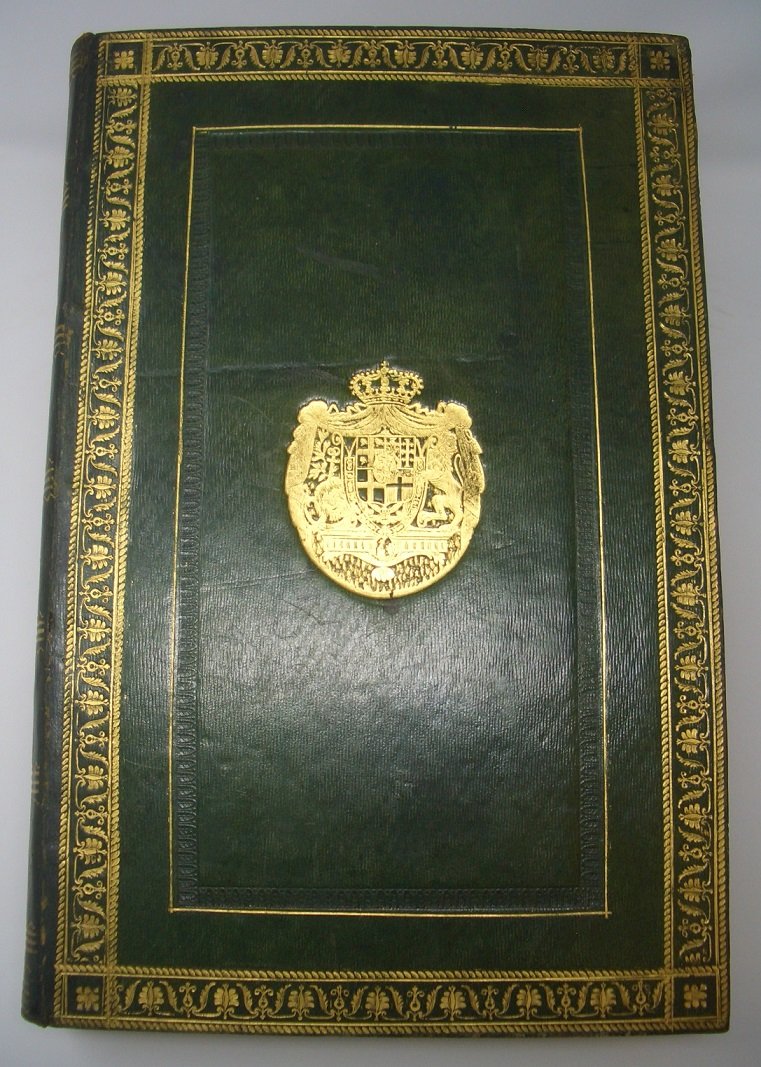>in-folio (350x235mm), pp. XVIII, 625, (1). Bella legatura piemontese alle armi di Carlo Felice in piena pelle verde, titolo in oro al dorso, ornato con filetti e fregi a forma di corona, sempre in oro; piatti con tre ordini di cornici, a secco e in oro con motivi floreali e vegetali e stemma di Carlo Felice al centro. Tagli dorati. Buon esemplare, assai fresco, in splendida legatura di casa Savoia.