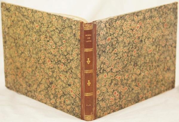 Bella raccolta di tredici spartiti per pianoforte, la gran parte pubblicati tra il 1860 e il 1880 circa circa rilegati insieme in una bella copertina in mezza pelle. I compositori sono quasi tutti contemporanei, tra i più famosi: Saverio Mercadante (1795-1870), Gaetano Donizetti (1797-1848), Vincenzo Bellini, Alessandro Betti ecc . Alcuni spartiti in calcografia, altri in litografia. Carta spessa. Elenchiamo gli spartiti presenti: - Saverio Mercadante - Il bravo - Firenze, G. Ricordi e c. (1865 circa) - Vincenzo Bellini - Scena e duetto "Si. sulla salma del fratello" nell'opera La Straniera Firenze, Gio. Ricordi (1865 circa) - Saverio Mercadante - Duetto "La Baldanza del tuo orgoglio" nell'opera Donna Caritea - Roma, Nella stamperia litografica di musica (1880 circa) - Saverio MErcadante - Scena ed aria "Ah se passo ai figli ancora" nell'opera Elisa e Claudio - Roma, Nella stamperia Litografica (1880 circa) - Gaetano Donizetti - L'esule di Roma Scena e Cavatina "Tacqui allor.l'abbandonai" - Roma, Nella stamperia litografica (1860 circa) - Gaetano Donizetti - Aria "A si tremendo annunzio" Nel belisario - Roma, Litografia Pittarelli (1860 circa) - Saverio Mercadante - Il bravo Scena e cantabile "Tranquillo Beato" - Napoli, B. Girard (1860 circa) - Saverio Mercadante - Il bravo Scena e romanza "All'età dell'innocenza" - Napoli, B. Girard (1860 circa) - Gaetano Donizetti - "Se la patria amici Numi" nell'Opera Furio Camillo - Roma, Lit. Pittarelli (1880 circa) - Vincenzo Bellini - I puritani opera seria in tre atti - Chiasso, dalla stamperia l'Euterpe Ticinese (1860 circa) - M. Cluber - Barcarola Amico legno ascendi nell'Opera La muta dei portici - Roma, presso gli editori via del Corso (1860 circa) - Rossini - La Serenata poesia del Conte G. Popoli Notturno a due voci - Roma, Lit. di Ratti e C. (1880 circa) - Alessandro Betti - La partenza romanza - Litografia Ratti e C. (1880 circa) Copertina in mezza pelle con titolo e decorazioni in oro al dorso in buone condizioni generali con lievi usure ai margini dorsO. Legatura in buone condizioni. All'interno le pagine si presentano in buone condizioni con rare fioriture. In folio. Dim. 26x35,5 cm. Pp. 133. Beautiufl collection of 13 scores for piano, the greatest part published beyween 1860 and 1880, all bound in an half leather cover. The composer are almost contemporary, the most famous: Saverio Mercadante (1795-1870), Gaetano Donizetti (1797-1848), Vincenzo Bellini, Alessandro Betti ecc . Some musical score in calcography, others in lythography. ecc . Wide paper COMPLETE LIST OF MUSICAL SCORES ABOVE. In good conditions. Half leather cover with golden title and decorations in the spine in good general conditions with worn edges, spine and corners. Binding in good conditions. Inside pages are in good conditions with occasional foxings. In folio. Dim. 26x35,5 cm. Pp. 133. Weight Kg. 1,200
