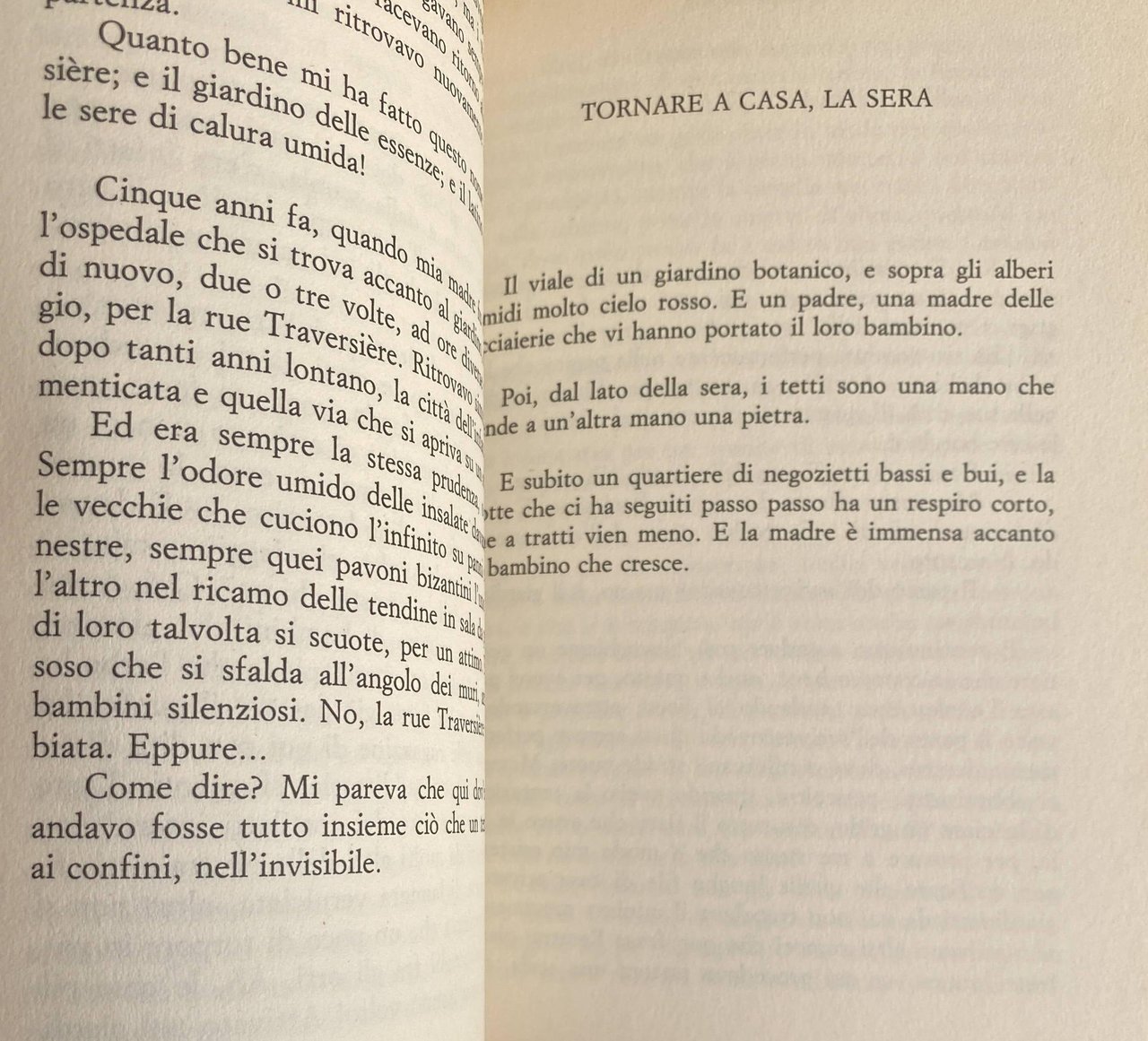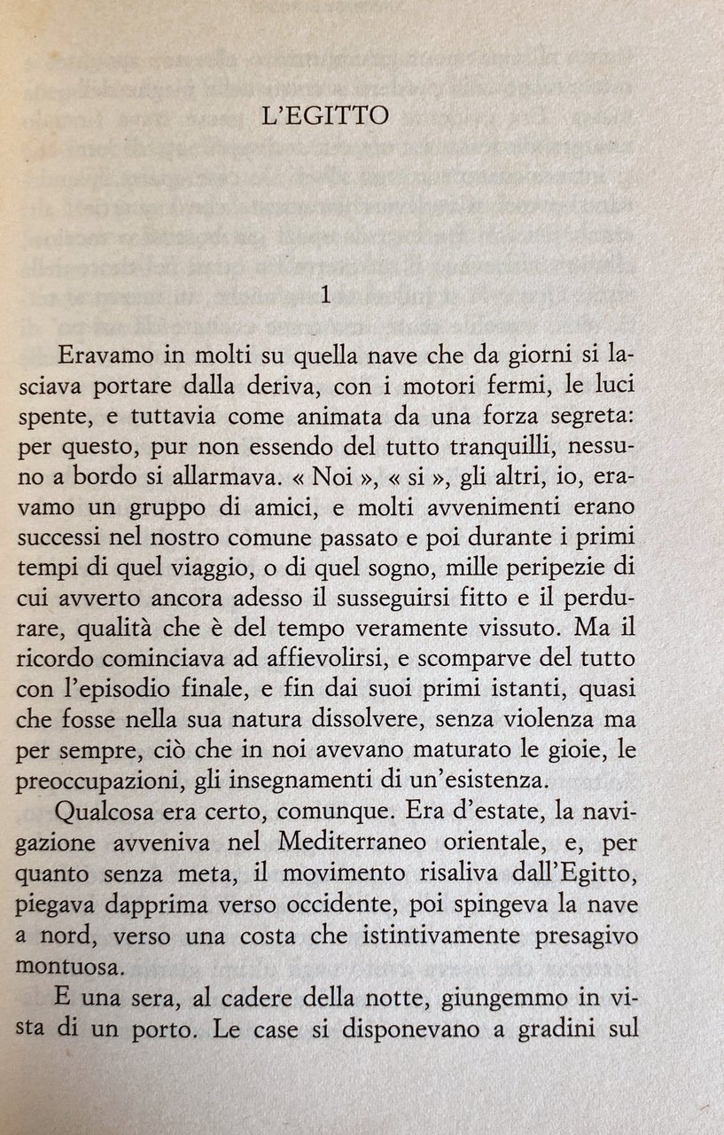 [...] L'Italia mi ha molto aiutato a ricordare come sotto le rappresentazioni, che fanno velo, vi sia una traccia, un presentimento dell'Unità. Quando vidi sorgere di fronte a me, in una indimenticabile prima sera fiorentina, la sconvolgente facciata di Santa Maria Novella, e poi la massa chiusa ma silenziosamente respirante di Orsanmichele, fu come se l'Uno si liberasse dal molteplice che è viluppo di modi d'approccio più che pluralità di parti, e come se nella parola similmente una via si aprisse, attraverso categorie e figure. E questo mi chiarì la mistica, o almeno il modo in cui taluni spiriti l'avevano vissuta Plotino, per esempio, che fu l'amico e ad un tempo lo spregiatore della forma nello spazio mediterraneo che mi si apriva così, come un libro. Una via difficile, senza dubbio, alla quale non m'illusi di avere accesso [...]
