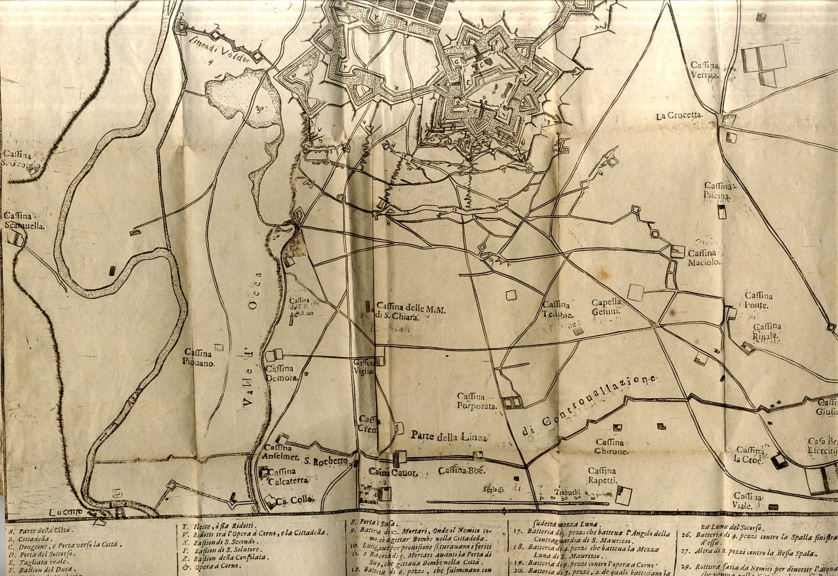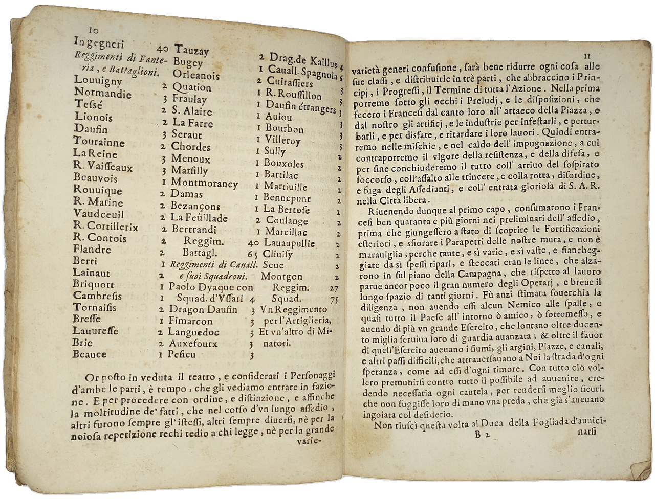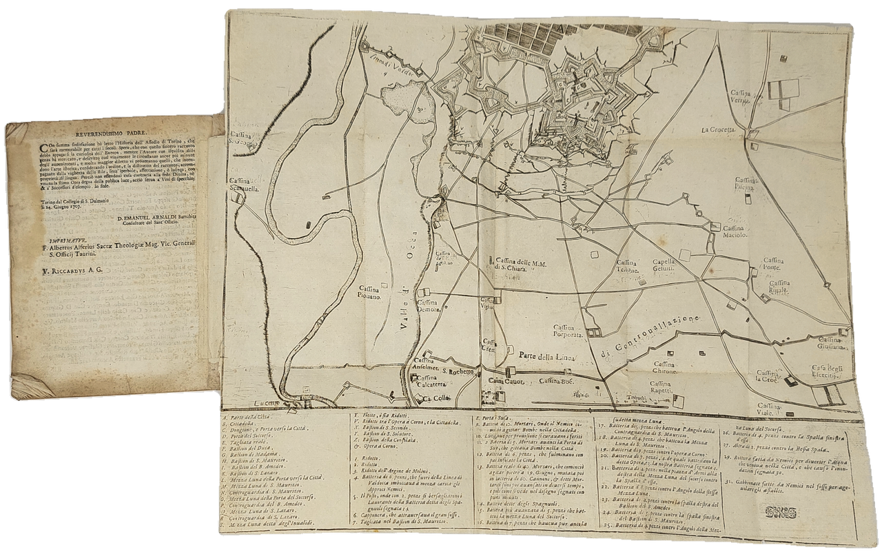 >in-4 (192x150 mm.), pp. (8), 104, in fine una grande carta topografica di Torino, della Cittadella e dintorni, incisa in rame e ripiegata fuori testo. Brochure coeva in carta decorata. Le pp. 95-103 elencano la lista degli ufficiali di S. M. Cesarea, morti e feriti nell'assedio di Torino. Prima edizione della relazione della gloriosa battaglia e liberazione di Torino assediata dai Francesi nel 1706, che è rarissima così completa della carta topografica. All'inizio dell' opera vi è la dedica a stampa ai lettori del Duca di Savoia Vittorio Amedeo. Buon esemplare, ma bruniture marginali, più estese al frontespizio, ai primi fogli e all'ultimo. A. Peyrot, Torino nei secoli, n.98