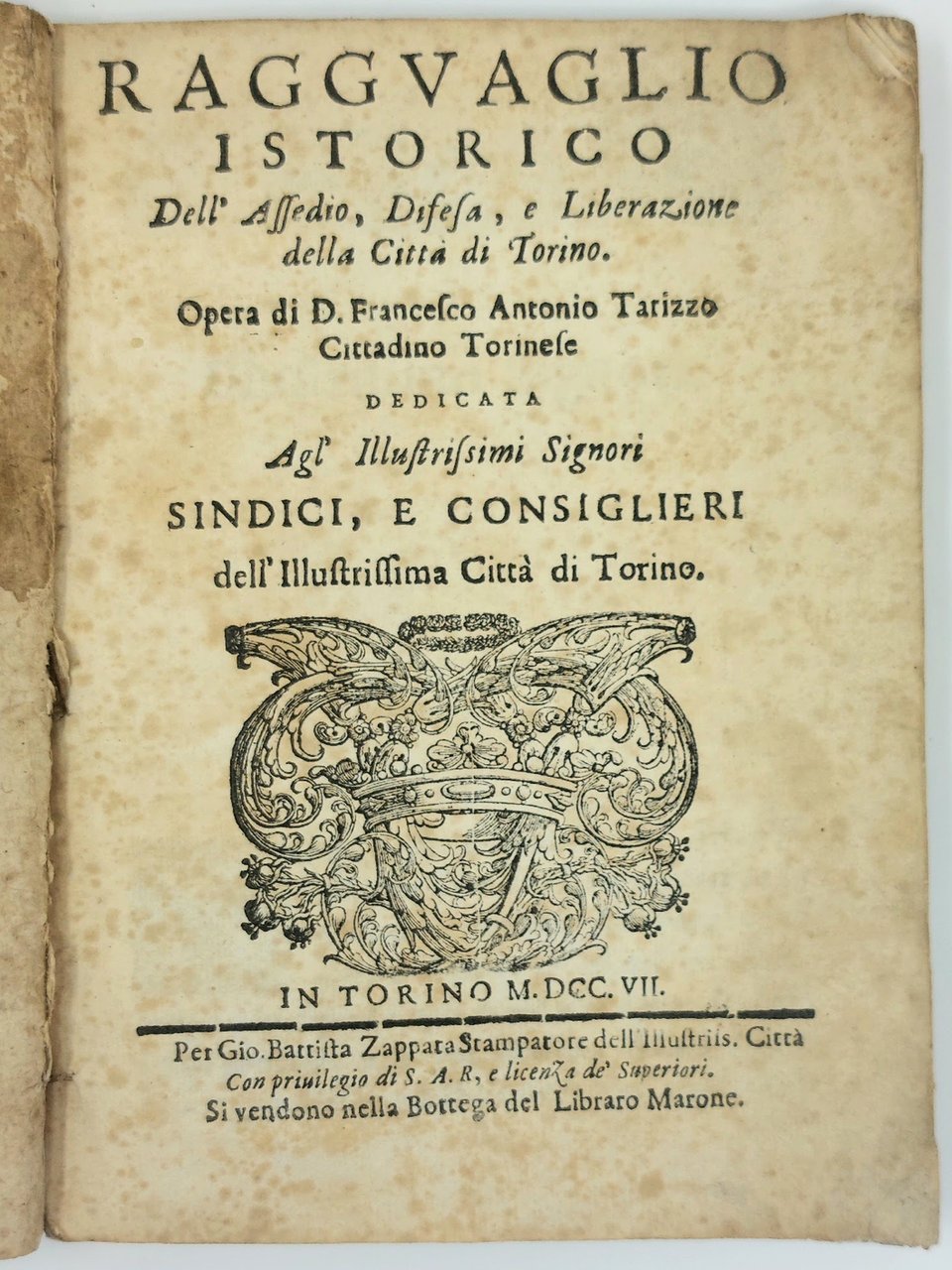 Ragguaglio Istorico dell'Assedio, Difesa e Liberazione della Città di Torino. Opera di D. Francesco Antonio Tarizzo cittadino Torinese. Dedicata ai Sindaci e Consiglieri dell'illustrissima città.