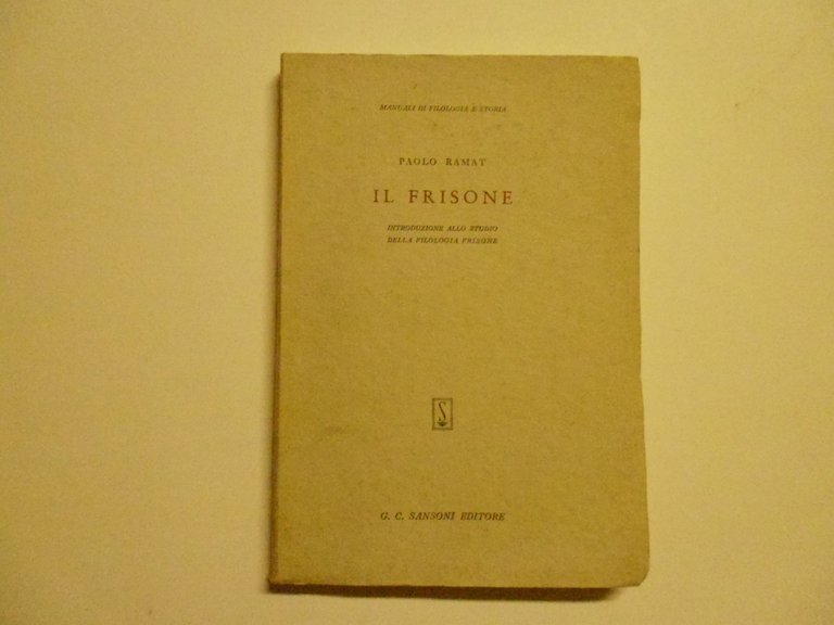 P. Ramat, Il Frisone Introduzione allo studio della filologia Frisone G. C. Sansoni Editore, Firenze, 1967. Cm 21,5x14,5; pp. 226; 1 carta ripiegata pi√π volte f. t. in b. n. Cartoncino edit. grigio. Condizioni di conservazione Esemplare in ottime condizioni di conservazione. Quasi allo stato di nuovo. Lievissime bruniture di polvere al fronte della coperta. SETT180.L21607G