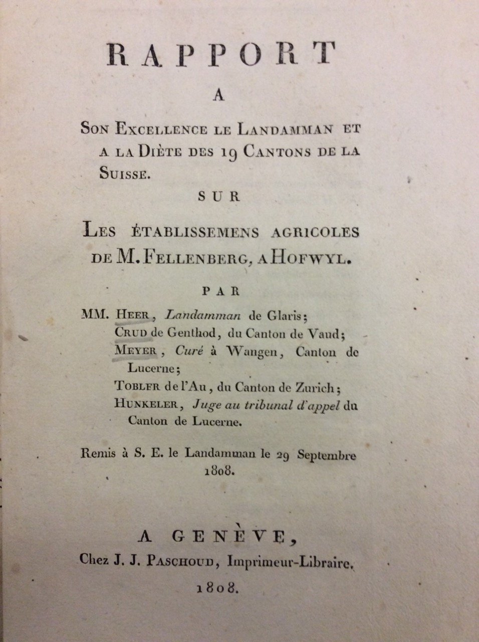 RAPPORT A SON EXCELLENCE LE LANDAMANN ET A LA DIETE DES 19 CANTONS DE LA SUISSE SUR LES ETABLISSEMENTS AGRICOLES DE M. FELLENBERG, A HOFWYL.