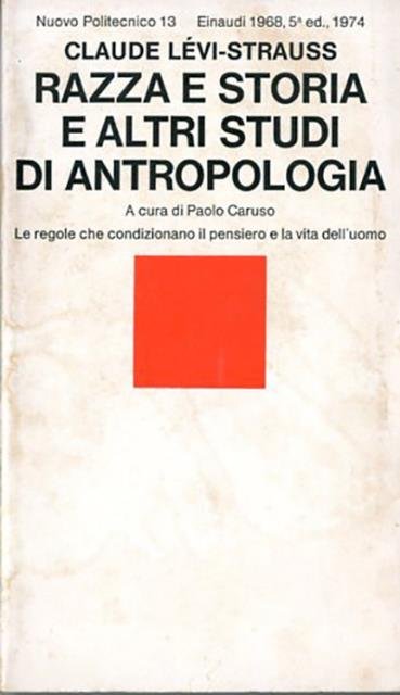 5. ed, stampa 1974. 291 p. ; 18 x 11 cm. Nuovo Politecnico, 13. L'opera raccoglie alcuni saggi dell'antropologo Claude Lévi-Strauss, famoso per aver applicato il metodo dell'indagine strutturalista agli studi antropologici. Temi ricorrenti nell'opera di Lévi-Strauss sono l'analisi dei meccanismi che condizionano il funzionamento del pensiero umano a livello universale (indipendentemente da differenze di razza, storia, geografia, cultura e società) e il concetto dei tre livelli fondamentali della comunicazione sociale: la comunicazione delle donne; la comunicazione dei beni e dei servizi; la comunicazione dei messaggi. In "Razza e storia" lo studioso propone uno sguardo oggettivo e privo di pregiudizi a popoli distanti nel tempo e nello spazio e definisce secondo la sua concezione strutturalista i concetti di "razza", "cultura", "etnocentrismo", ecc. Con il saggio "La famiglia" lo studioso presenta una rapida panoramica delle varie strutture familiari nelle diverse culture. In 'Babbo Natale suppliziato' prendendo spunto da un singolare fatto di cronaca, propone un'interpretazione antropologica di un mito occidentale. A cura di Paolo Caruso. Complemento del titolo in copertina : Le regole che condizionano il pensiero e la vita dell'uomo. Brossura editoriale, coperta in cartoncino flessibile (b/n e rosso). Segni dal tempo alla copertina per il resto libro integro. Codice libreria 7956.